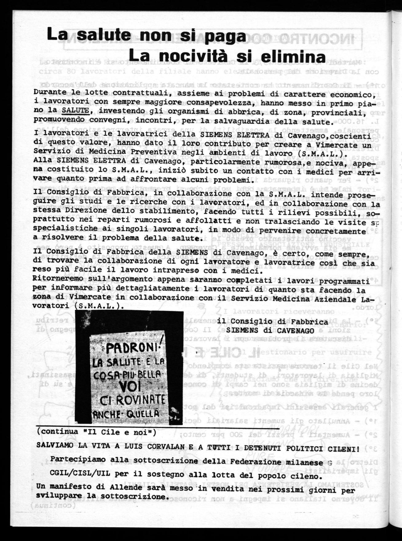 Sventolando la bandiera del guadagno facile molti industriali sono riusciti ad ottenere fino ad oggi dagli operai la prestazione dello straordinario sen za il controllo necessario perchè non si superassero le ore come da contrat to. Una situazione del genere era presente fino a pochi giorni fa anche alla Siemens. La pressione di dirigenti e capì reparto condizionava un numero rilevante di lavoratori che, interpellati personalmente, cedevano alle richieste. Molte le argomentazioni usate per invogliare i lavoratori affinchè acconsentissero: guadagno di qualche 10 mila in più, esigenze di forniture urgenti per non pagare penali, impegni di produzione indilazionabili, ecc. Detto questo, si dovrebbero adesso tirare le conclusioni. Tutti i documenti congressuali (congressi svolti quest'anno) delle Organizzazioni Sindacali, presentano lo "Straordinario" come una piaga da curare e guarire. Esso è un'arma a doppio taglio che può rivolgersi contro gli stessi lavoratori; una azienda che si appoggia allo straordinario vuol dire che non ha programmi d'investimento immediati e che soprattutto non vuole creare nuovi posti di lavoro.