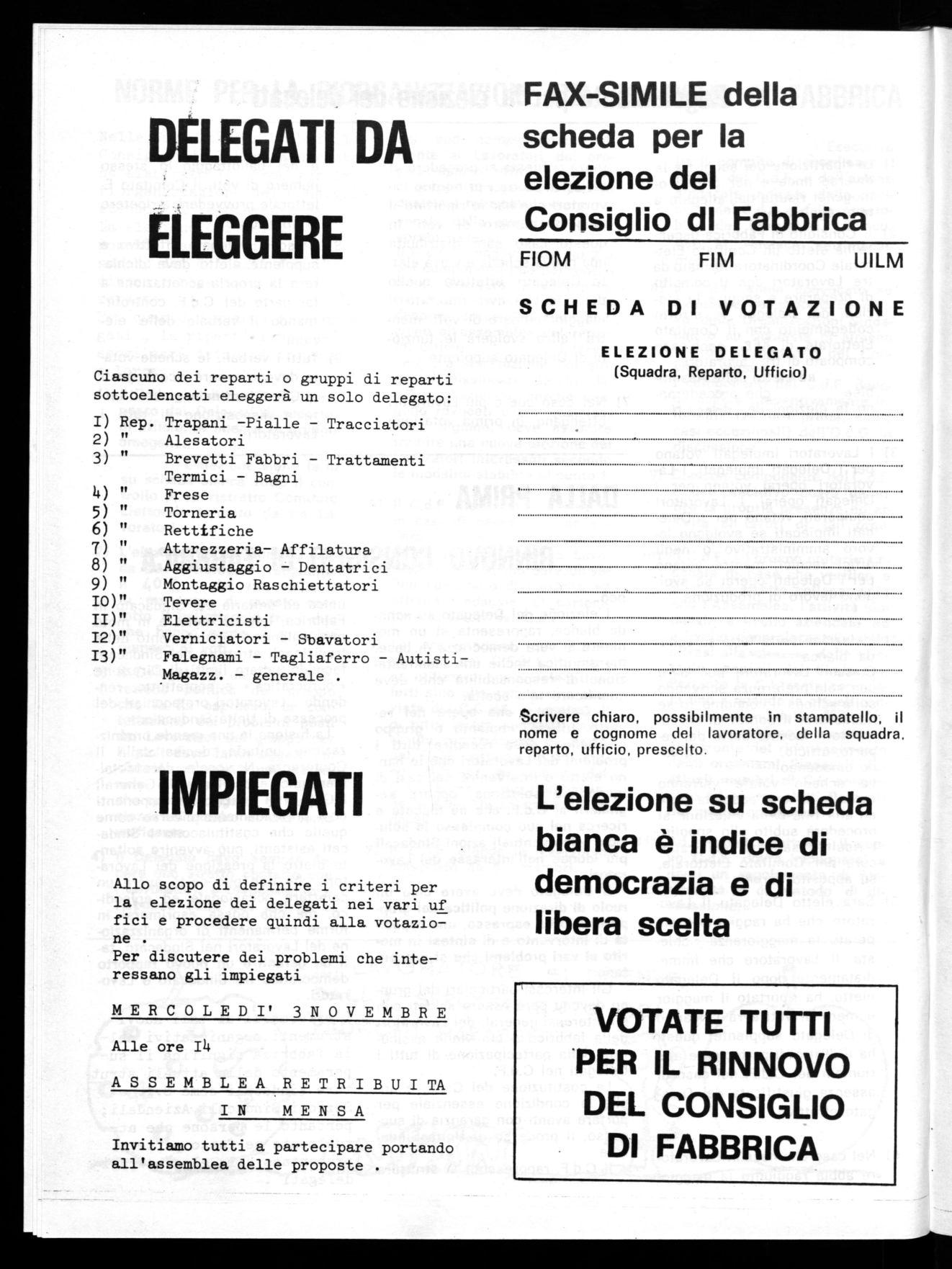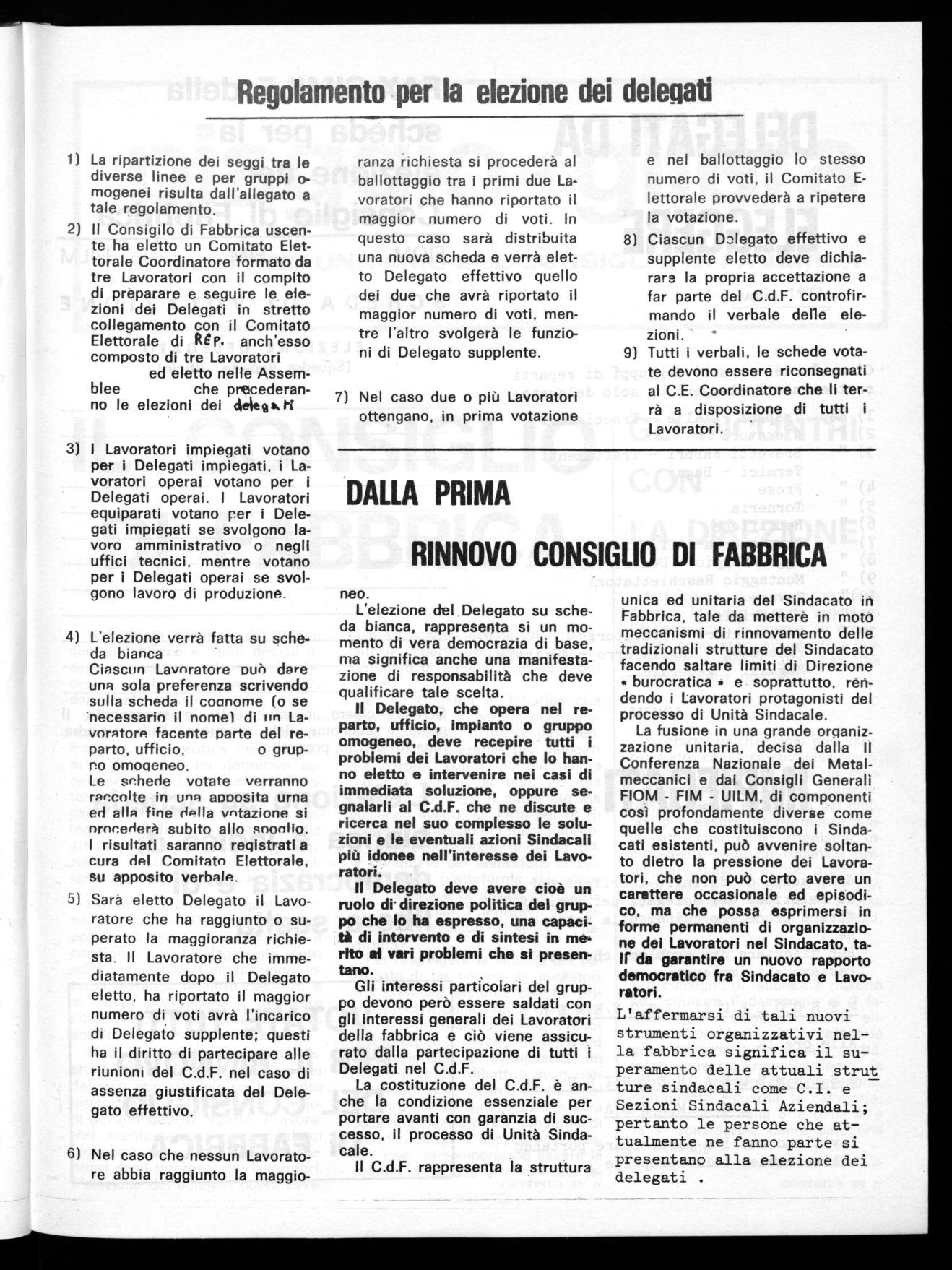Nelle sue ultime riunioni il Consiglio di Fabbrica uscente ha elaborato le norme per la riorganizzazione del Consiglio stesso, il regolamento per la elezione dei delegati, nonché la ripartizione del numero dei delegati fra i diversi reparti o gruppi di reparto.