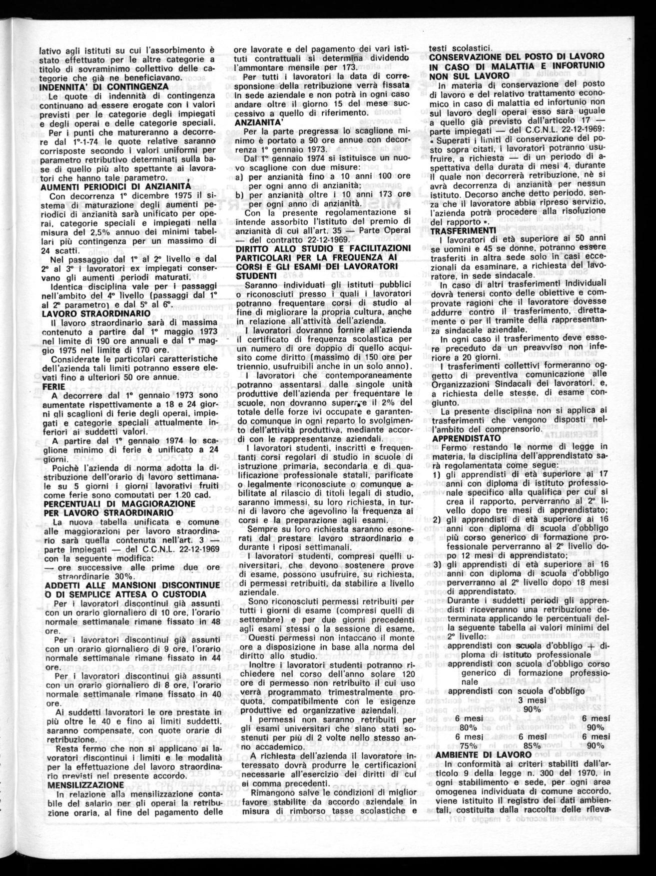 Dal 1° gennaio 1974 si istituisce un nuovo scaglione con due misure: per anzianità fino a 10 anni 100 ore per ogni anno di anzianità; per anzianità oltre i 10 anni 173 ore per ogni anno di anzianità.