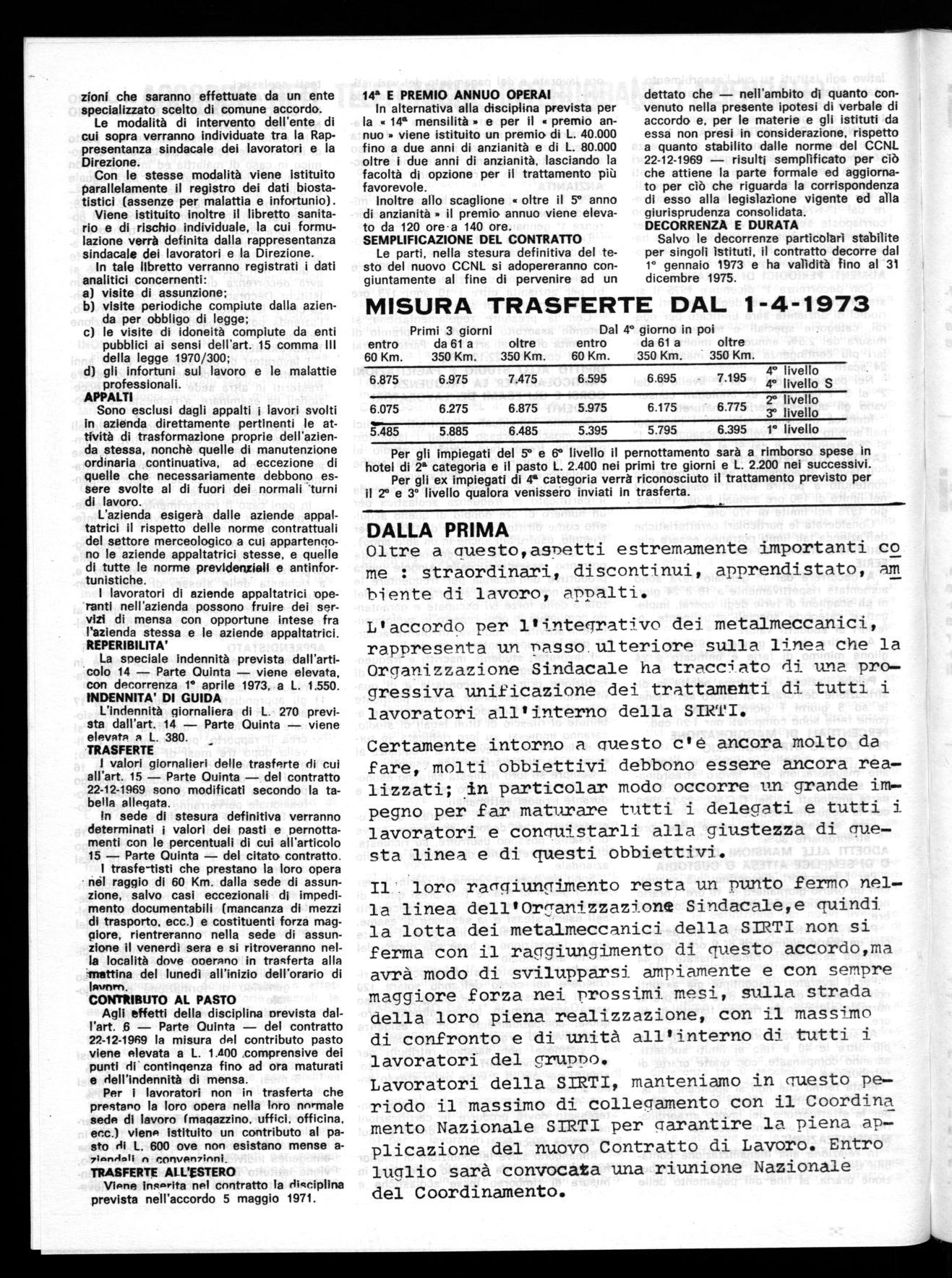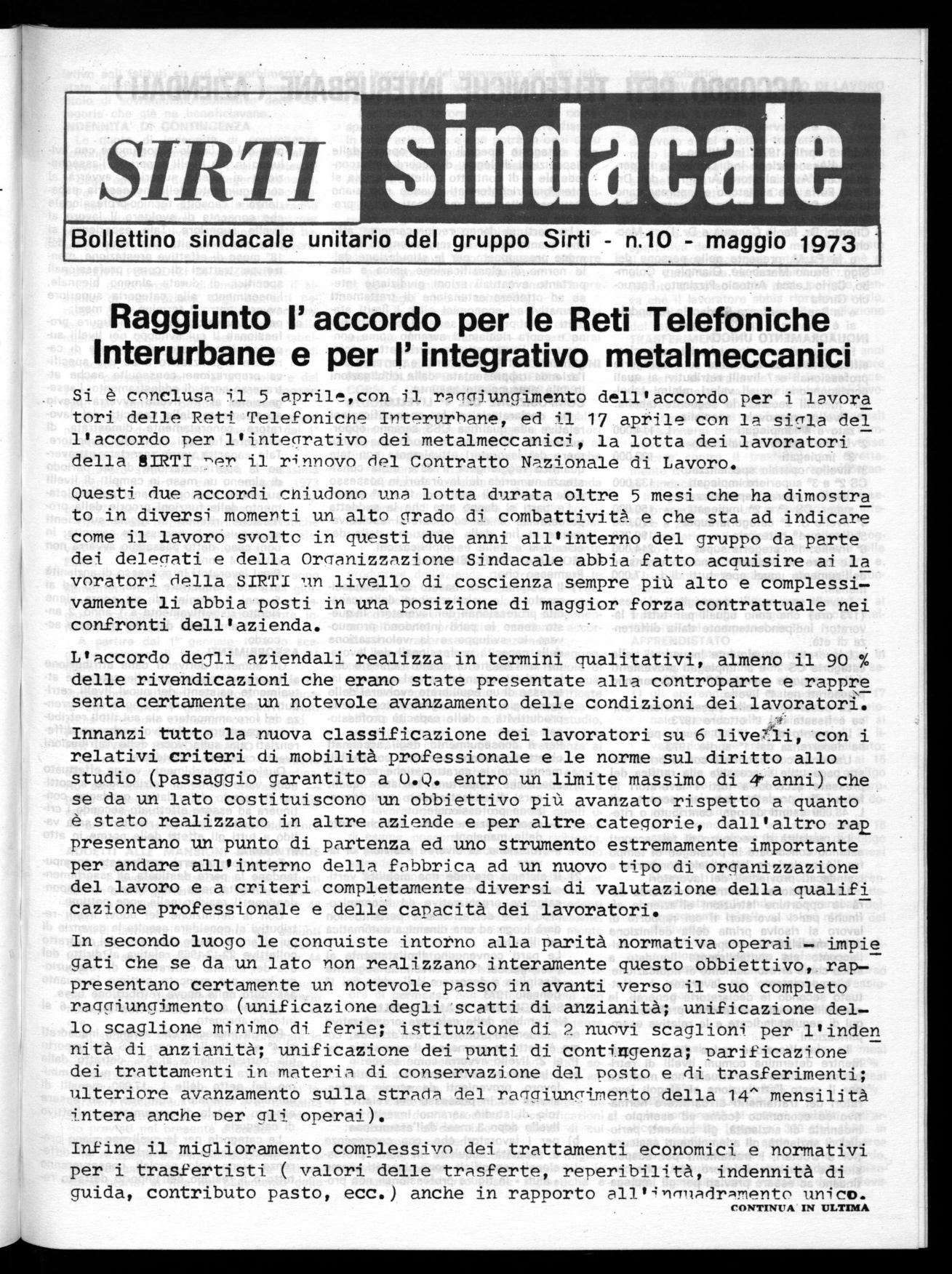 IL loro raggiungimento resta un punto fermo nella linea dell'Organizzazione Sindacale,e quindi la lotta dei metalmeccanici della SIRTI non si ferma con il raggiungimento di questo accordo,ma avrà modo di svilupparsi ampiamente e con sempre maggiore forza nei prossimi mesi, sulla strada della loro piena realizzazione, con il massimo di confronto e di unità all'interno di tutti i lavoratori del gruPpo.
