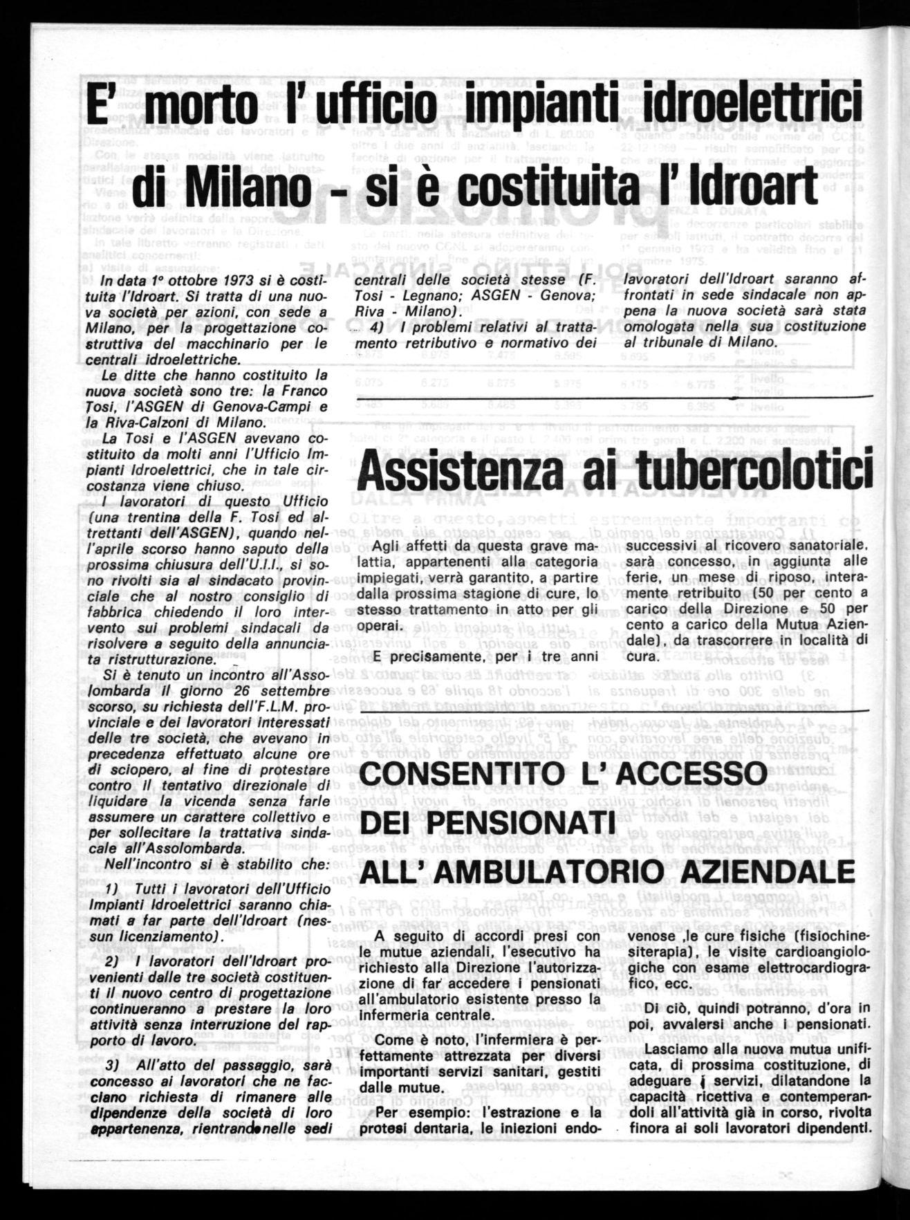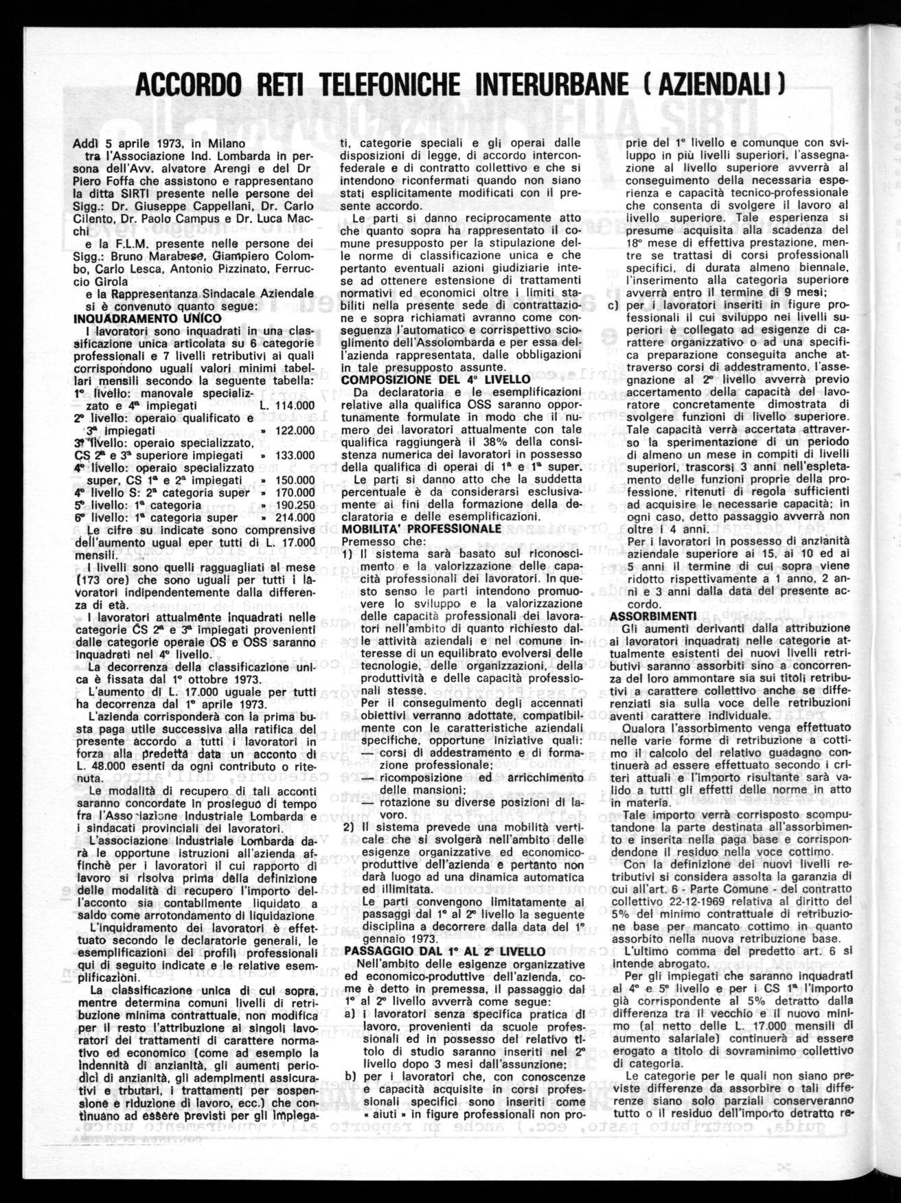 Addì 5 aprile 1973, in Milano tra l'Associazione Ind. Lombarda in persona dell'Avv. alvatore Arengi e del Dr Piero Foffa che assistono e rappresentano la ditta SIRTI presente nelle persone dei Sigg.: Dr. Giuseppe Cappellani, Dr. Carlo Cilento, Dr. Paolo Campus e Dr. Luca Macchi