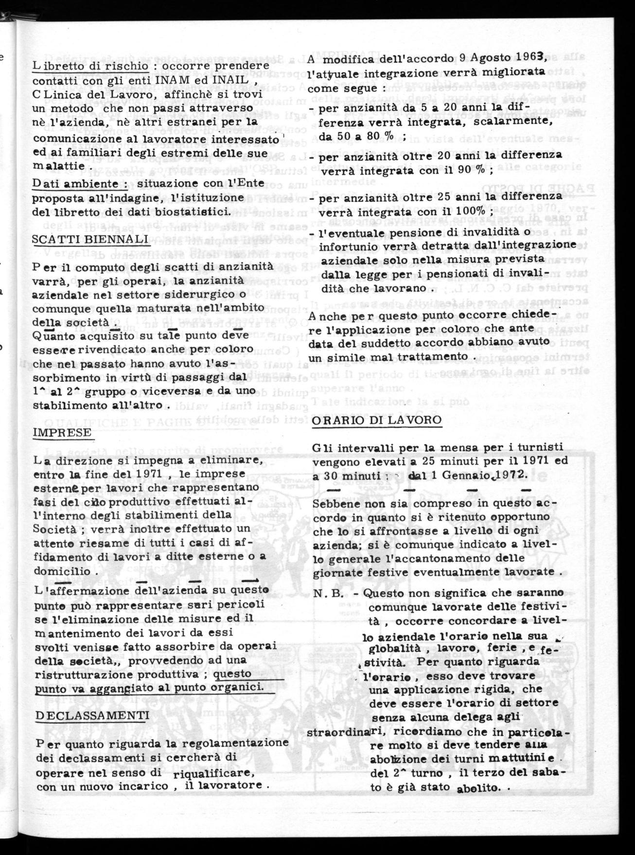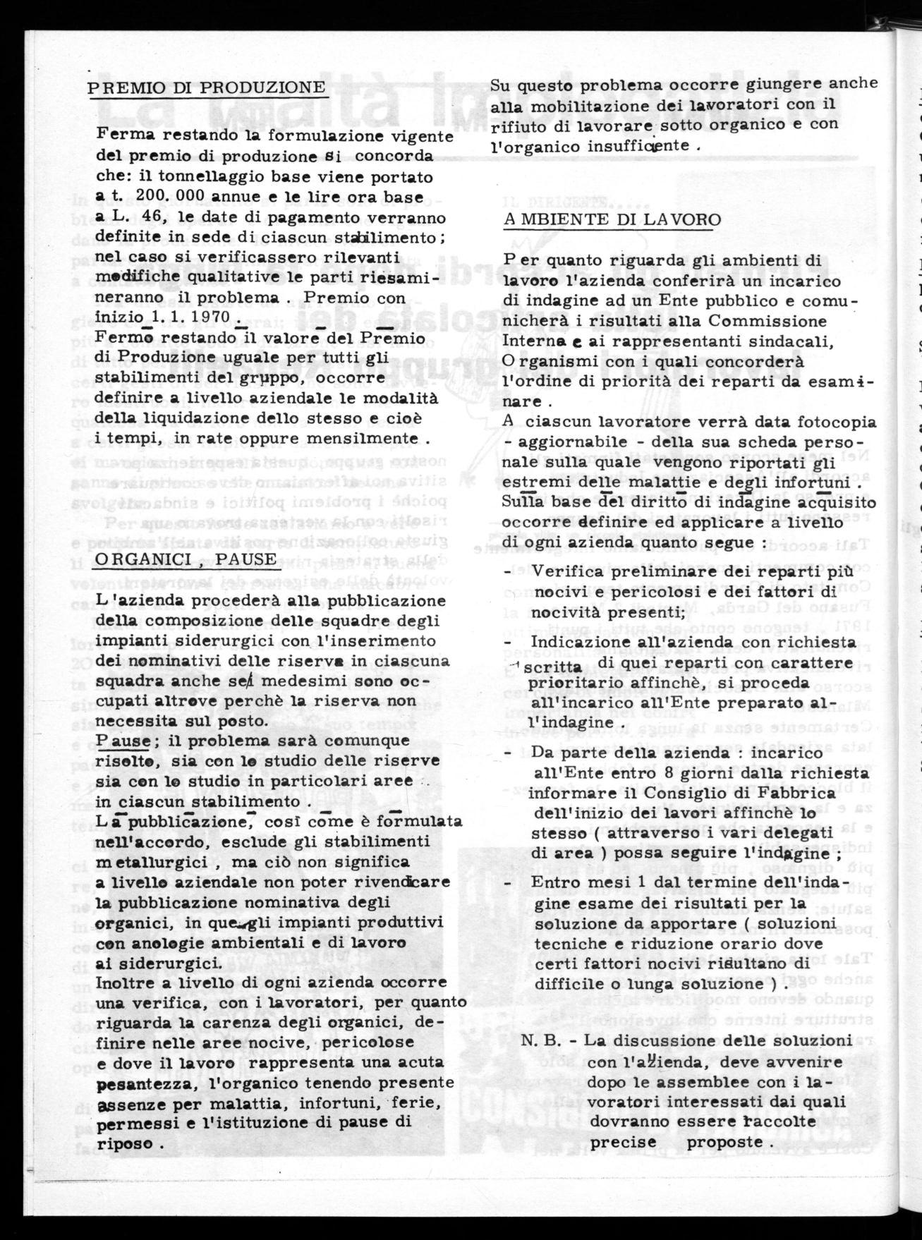 N. B. - Questo non significa che saranno comunque lavorate delle festività , occorre concordare a livello aziendale l'orario nella sua globalità , lavoro, ferie , e festività. Per quanto riguarda l'orario , esso deve trovare una applicazione rigida, che deve essere l'orario di settore senza alcuna delega agli straordinalri, ricordiamo che in particolare molto si deve tendere alla abolizione dei turni mattutini e del 2" turno , il terzo del sabato è già stato abolito. •