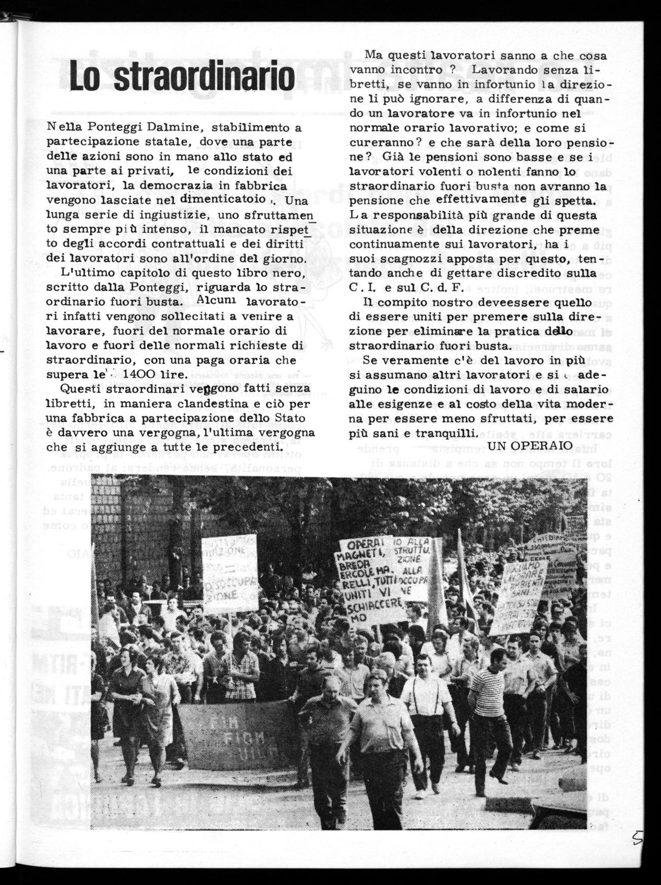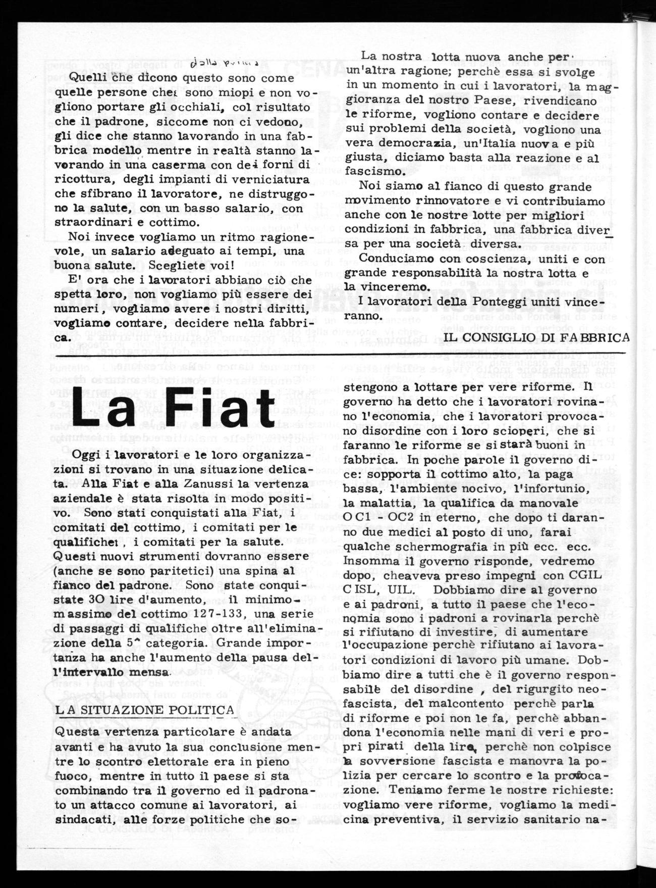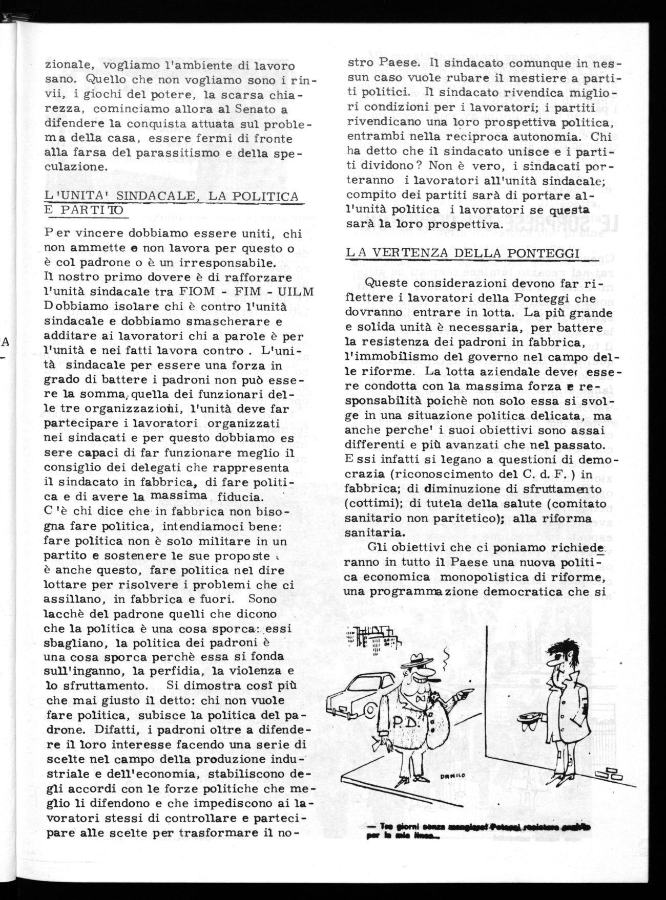 C 'è chi dice che in fabbrica non bisogna fare politica, intendiamoci bene: fare politica non è solo militare in un partito e sostenere le sue proposte è anche questo, fare politica nel dire lottare per risolvere i problemi che ci assillano, in fabbrica e fuori. Sono lacchè del padrone quelli che dicono che la politica è una cosa sporca: essi sbagliano, la politica dei padroni è una cosa sporca perchè essa si fonda sull'inganno, la perfidia, la violenza e lo sfruttamento. Si dimostra così più che mai giusto il detto: chi non vuole fare politica, subisce la politica del padrone. Difatti, i padroni oltre a difendere il loro interesse facendo una serie di scelte nel campo della produzione industriale e dell'economia, stabiliscono degli accordi con le forze politiche che meglio li difendono e che impediscono ai lavoratori stessi di controllare e partecipare alle scelte per trasformare il no-