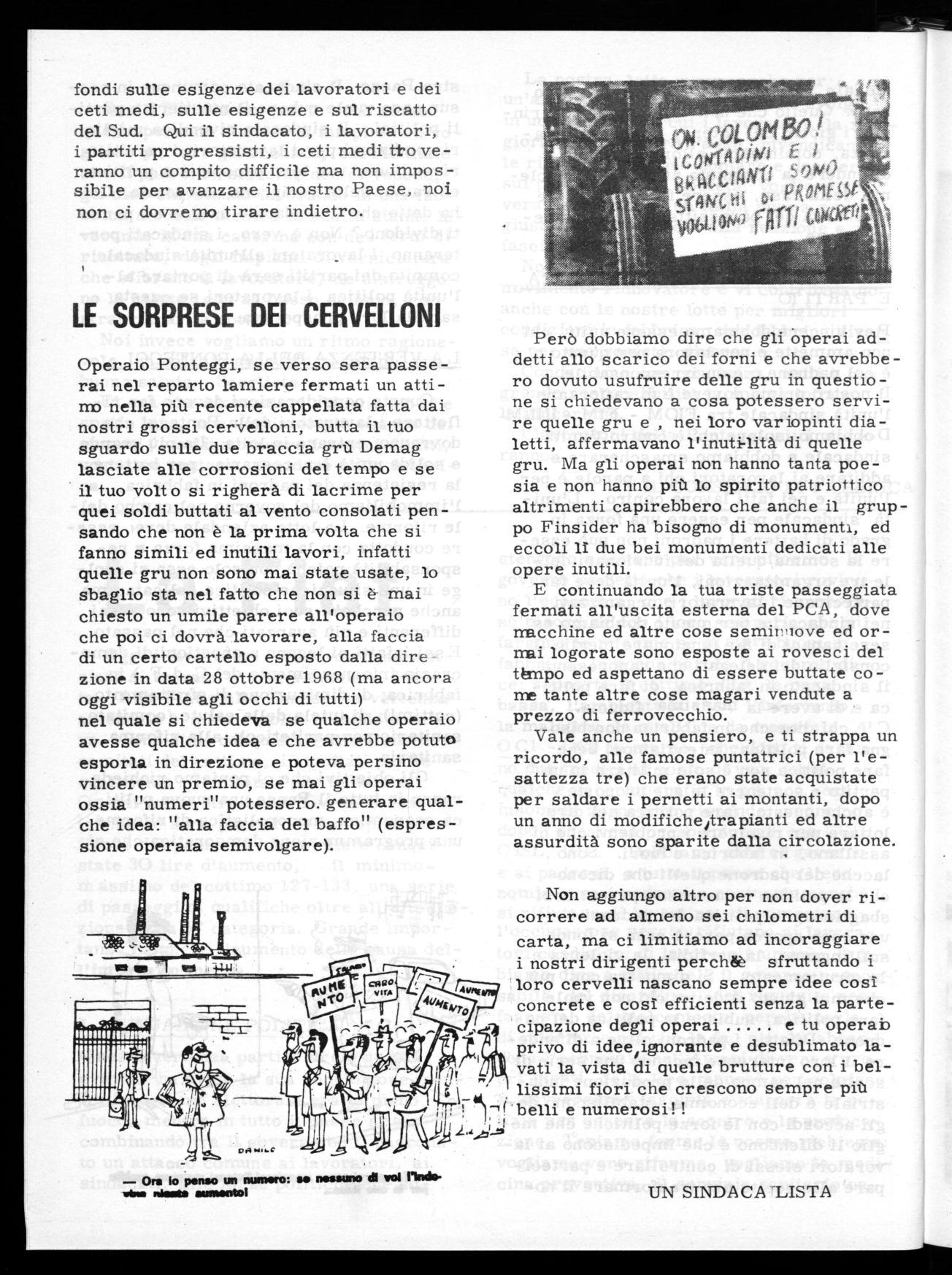 Operaio Ponteggi, se verso sera passerai nel reparto lamiere fermati un attira) nella più recente cappellata fatta dai nostri grossi cervelloni, butta il tuo sguardo sulle due braccia grù. Demag lasciate alle corrosioni del tempo e se il tuo volto si righerà di lacrime per quei soldi buttati al vento consolati pensando che non è la prima volta che si fanno simili ed inutili lavori, infatti quelle gru non sono mai state usate, lo sbaglio sta nel fatto che non si è mai chiesto un umile parere all'operaio che poi ci dovrà lavorare, alla faccia di un certo cartello esposto dalla dire zione in data 28 ottobre 1968 (ma ancora oggi visibile agli occhi di tutti) nel quale si chiedeva se qualche operaio avesse qualche idea e che avrebbe potuto esporla in direzione e poteva persino vincere un premio, se mai gli operai ossia "numeri" potessero. generare qualche idea: "alla faccia del baffo" (espressione operaia semivolgare).