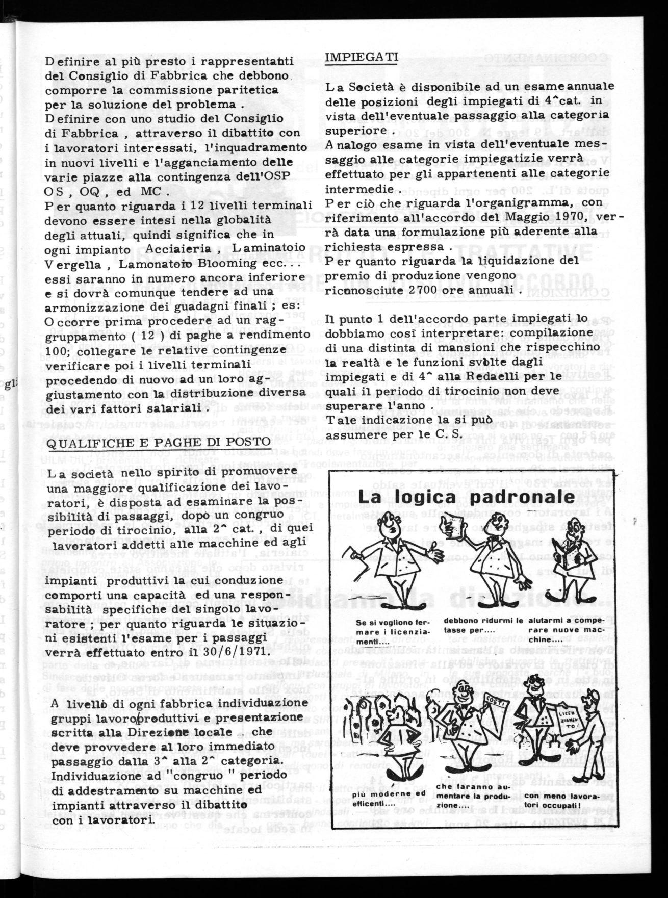 Oggi i lavoratori e le loro organizzazioni si trovano in una situazione delicata. Alla Fiat e alla Zanussi la vertenza aziendale è stata risolta in modo positivo. Sono stati conquistati alla Fiat, i comitati del cottimo, i comitati per le qualifichei , i comitati per la salute. Questi nuovi strumenti dovranno essere (anche se sono paritetici) una spina al fianco del padrone. Sono state conquistate 30 lire d'aumento, il minimom assimo del cottimo 127-133, una serie di passaggi di qualifiche oltre all'eliminazione della 5" categoria. Grande importanza ha anche l'aumento della pausa dell'intervallo mensa.