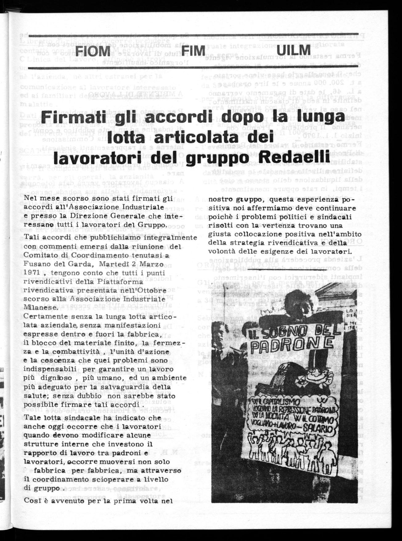 Tali accordi che pubblichiamo integralmente con commenti emersi dalla riunione del Comitato di Coordinamento tenutasi a ,usano del Garda, Martedì. 2 Marzo 1971 , tengono conto che tutti i punti rivendicativi della Piattaforma rivendicativa presentata nell'Ottobre scorso alla Associazione Industriale Nfilanese.