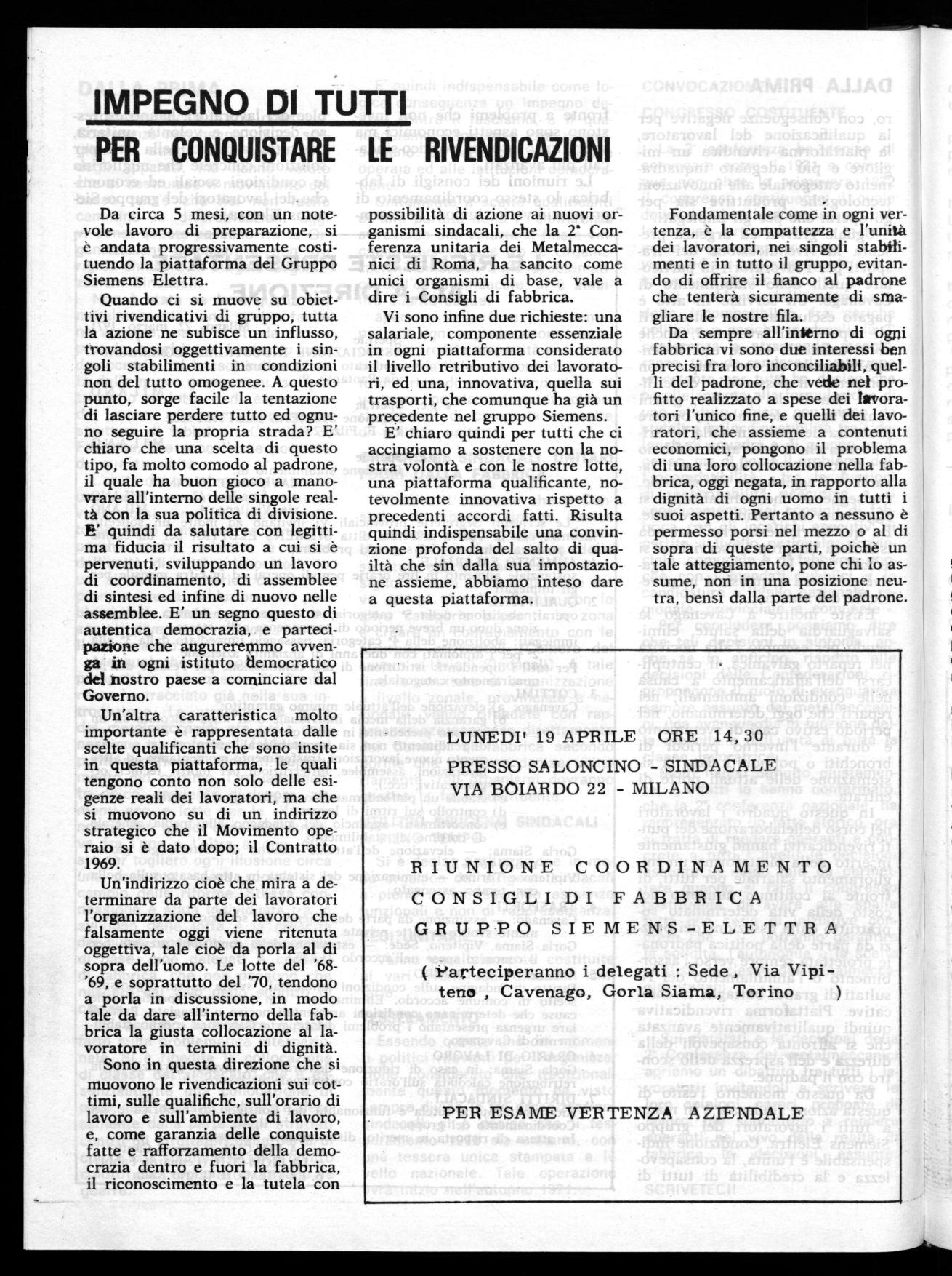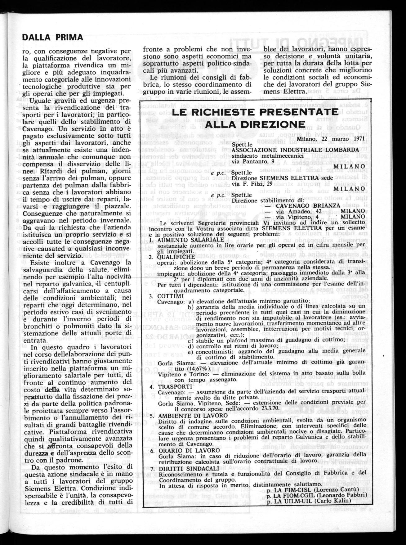 Da una diecina di giorni si è conclusa la fase preparatoria e di elaborazione della piattaforma rivendicativa per tutto il gruppo Siemens Elettra. Una fase impegnativa che, attraverso un'intensa attività di riunioni dei consigli di fabbrica ed assemblee di stabilimento, ha consentito una maggiore conoscenza dei problemi aperti ed un arricchimento di elementi e di argomenti sui contenuti rivendicativi presentati da alcuni giorni alla Direzione.