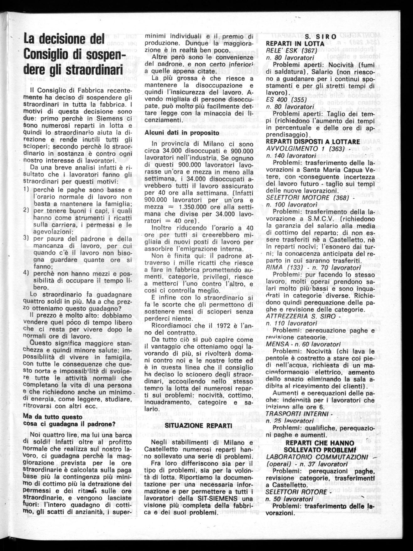 Il Consiglio di Fabbrica recentemente ha deciso di sospendere gli straordinari in tutta la fabbrica. I motivi di questa decisione sono due: primo perchè in Siemens ci Sono numerosi reparti in lotta e quindi lo straordinario aiuta la direzione e rende inutili tutti gli scioperi; secondo perchè lo straordinario in sostanza è contro ogni nostro interesse di lavoratori.