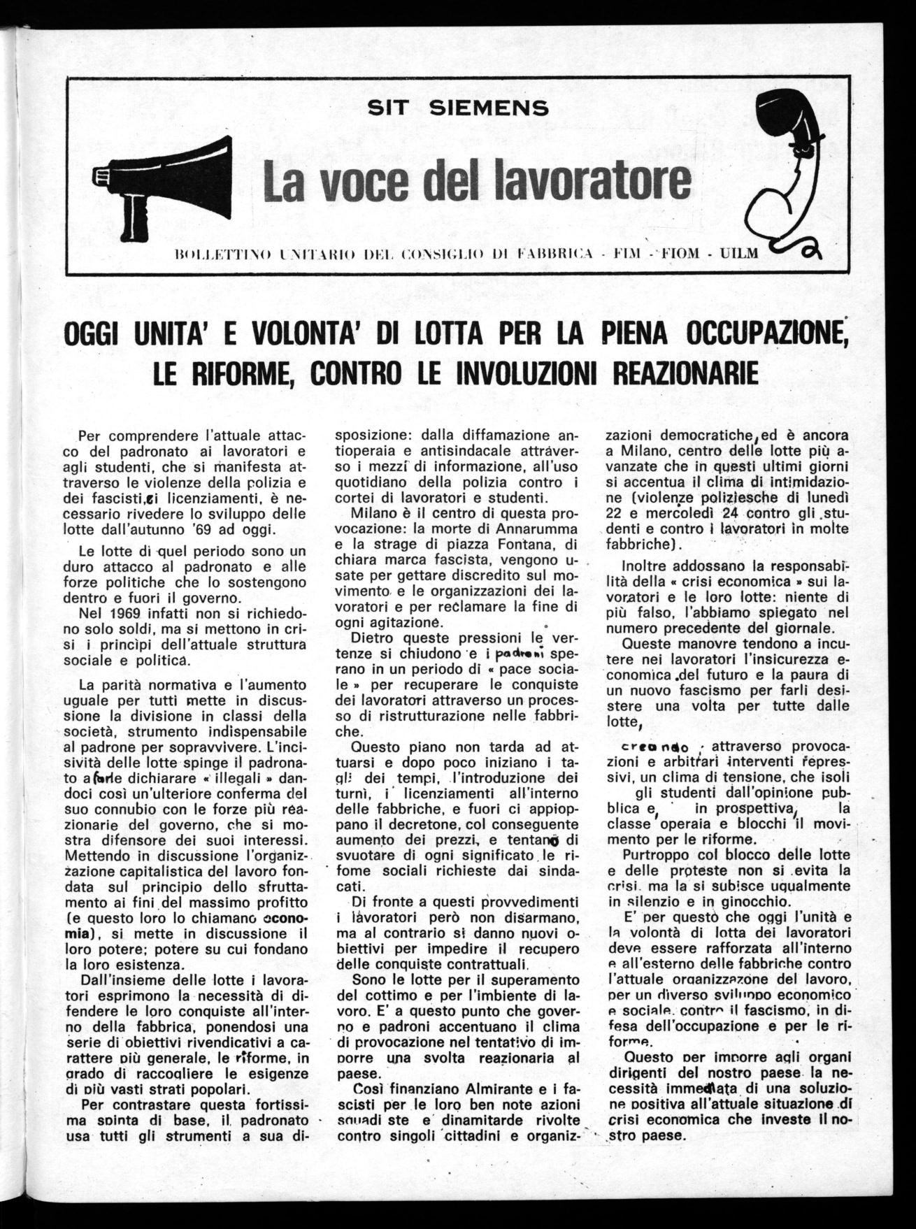 Il giornale ha lo scopo di informare i lavoratori sui lavori del Consiglio, sui prpblemi di fabbrica e sulla situazione politica. Chiunque può collaborare inviando notizie e documenti alla redazione del giornale.