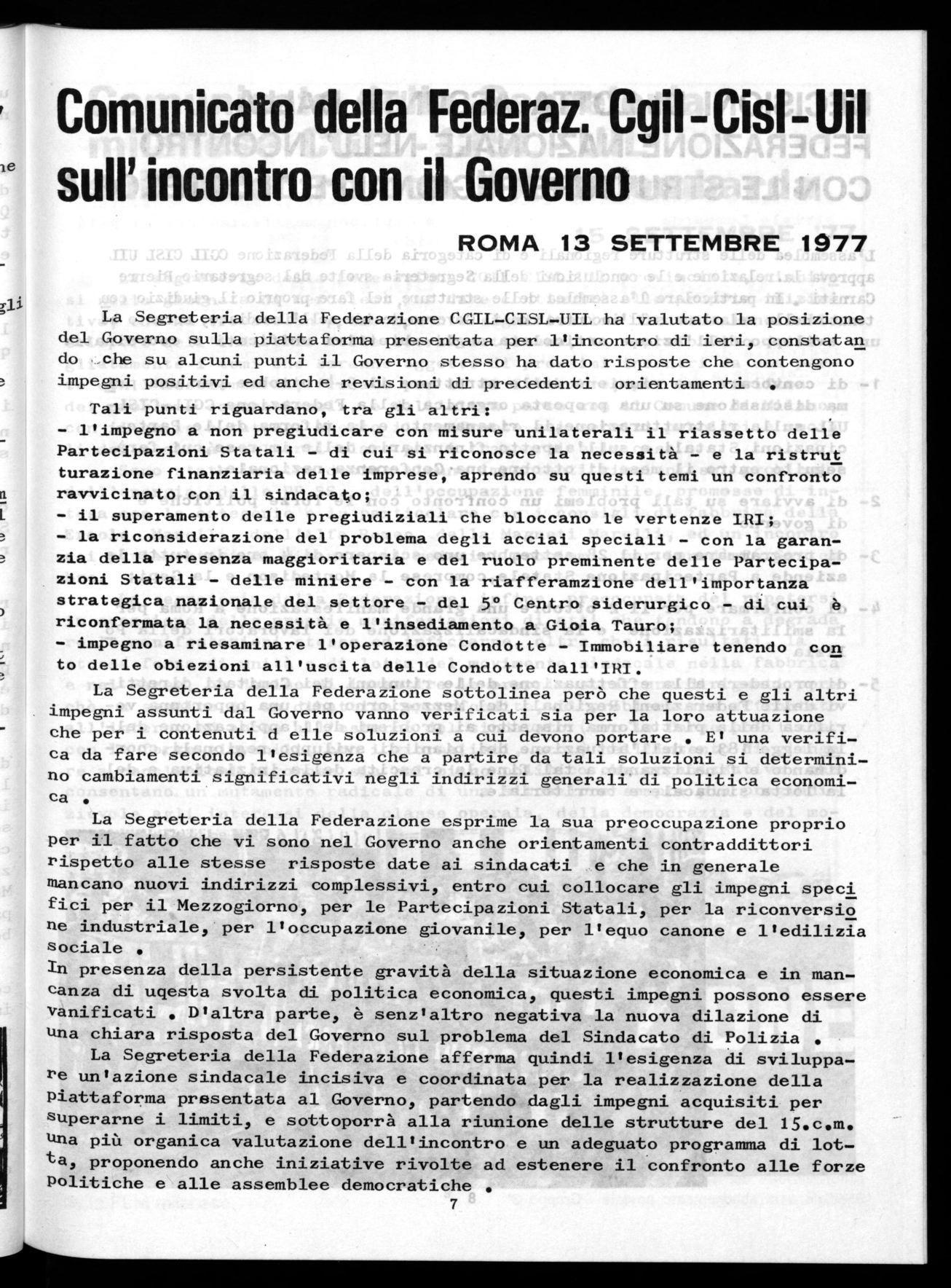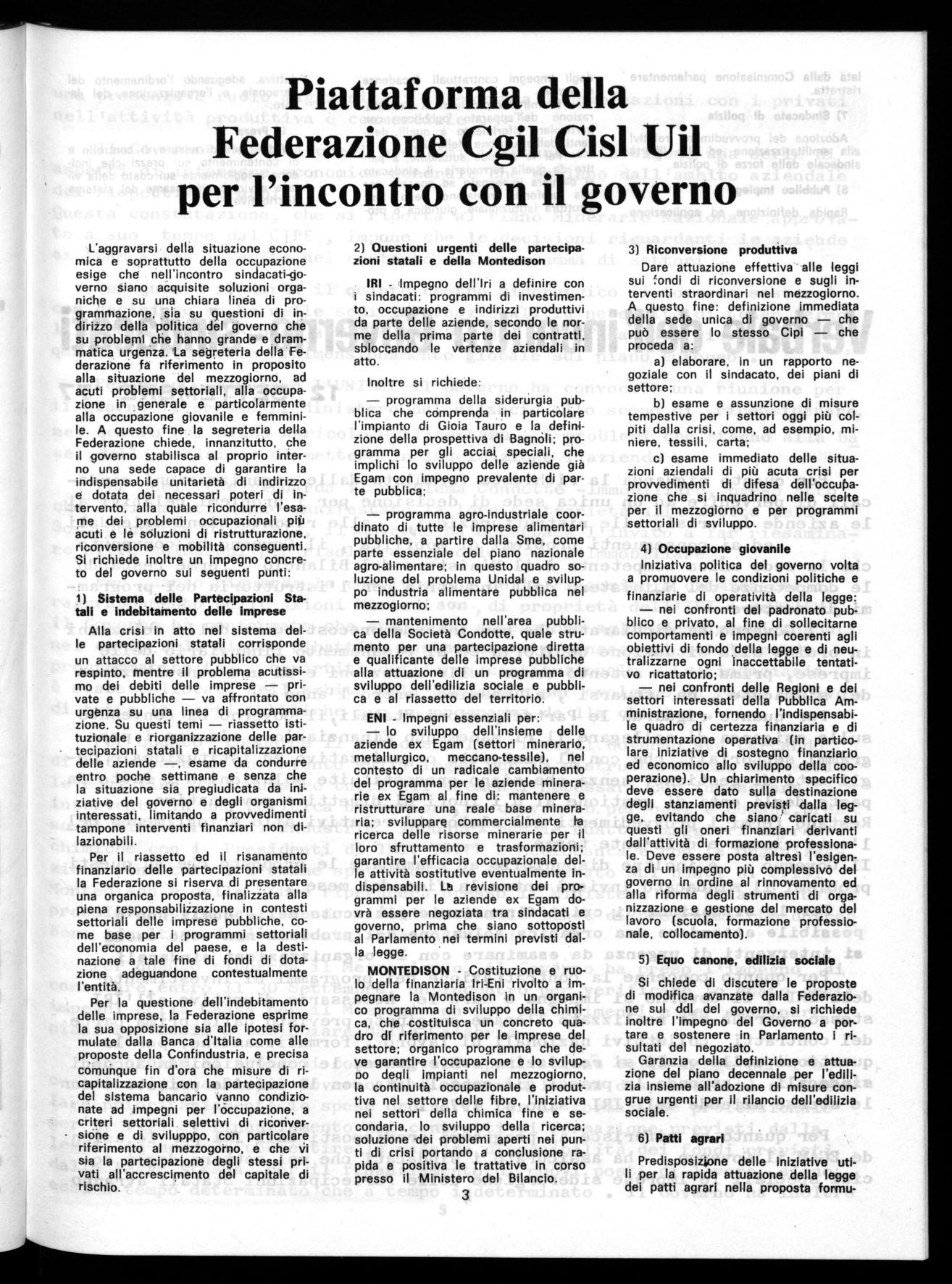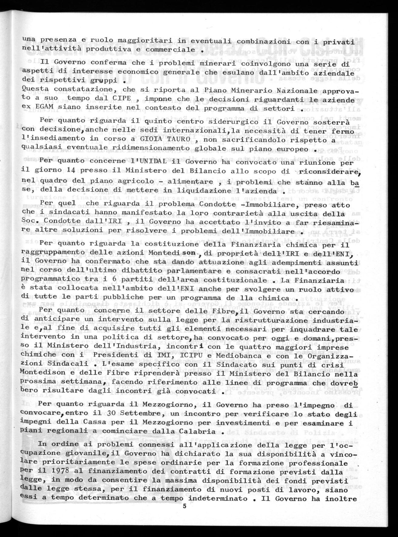 L'aggravarsi della situazione economica e soprattutto della occupazione esige che nell'incontro sindacati-governo siano acquisite soluzioni organiche e su una chiara linea di programmazione, sia su questioni di indirizzo della politica del governo che su problemi che hanno grande e drammatica urgenza. La segreteria della Federazione fa riferimento in proposito alla situazione del mezzogiorno, ad acuti problemi settoriali, alla occupazione in generale e particolarmente alla occupazione giovanile e femminile. A questo fine la segreteria della Federazione chiede, innanzitutto, che il governo stabilisca al proprio interno una sede capace di garantire la indispensabile unitarietà di indirizzo e dotata dei necessari poteri di intervento, alla quale ricondurre l'esame dei problemi occupazionali più acuti e le soluzioni di ristrutturazione, riconversione e mobilità conseguenti. Si richiede inoltre un impegno concreto del governo sui seguenti punti: