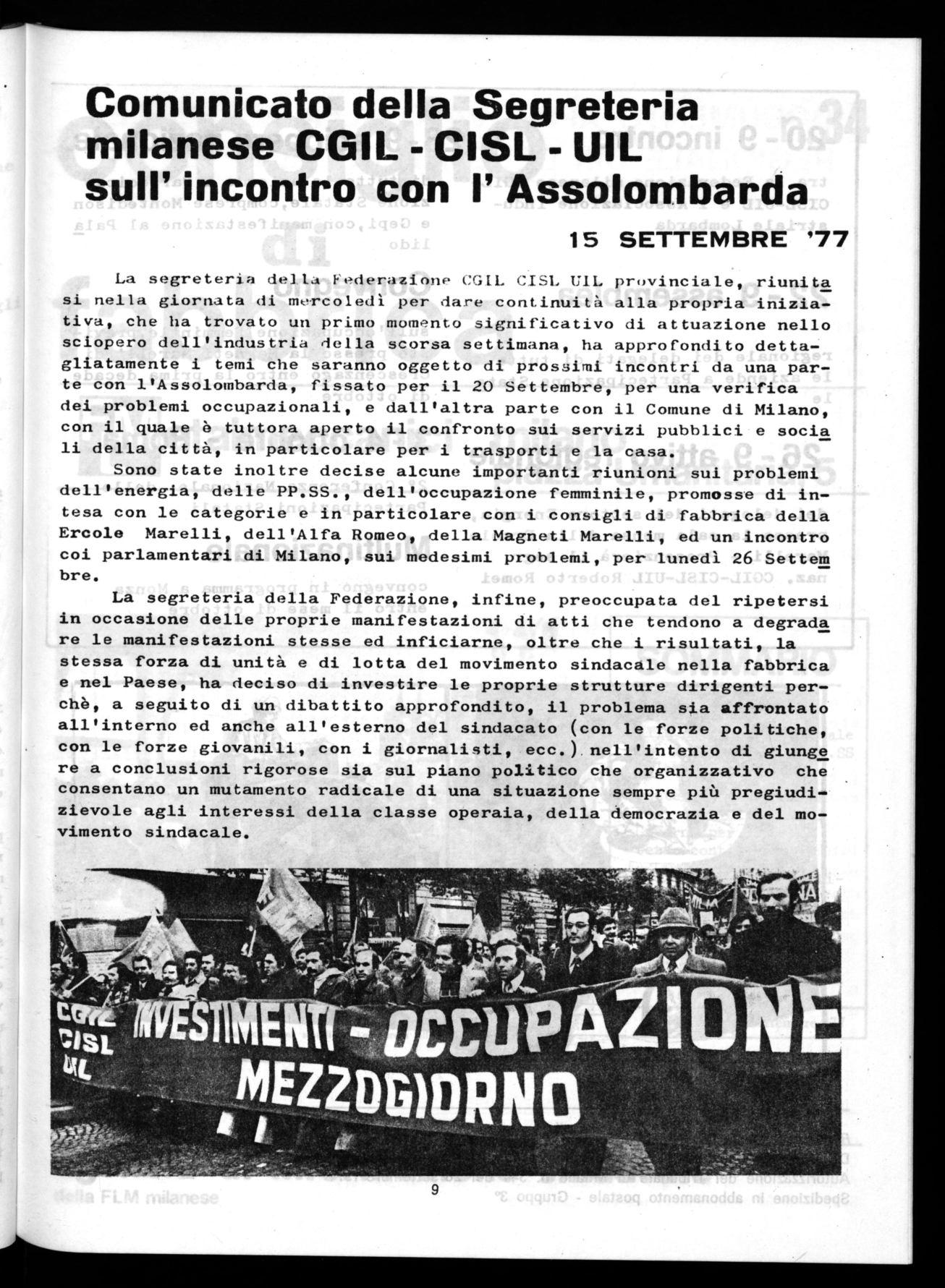 Sono state inoltre decise alcune importanti riunioni sui problemi dell'energia, delle PP.SS., dell'occupazione femminile, promosse di intesa con le categorie e in particolare con i consigli di fabbrica della Ercole Marelli, dell'Alfa Romeo, della Magneti Marelli, ed un incontro coi parlamentari di Milano, sui medesimi problemi, per lunedì 26 Settem bre.