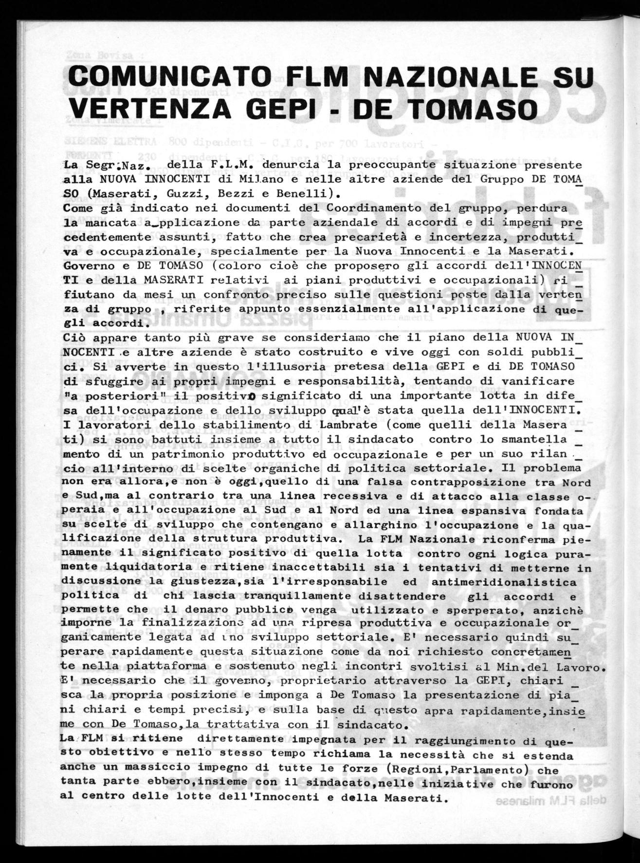 COMUNICATO FLM NAZIONALE SU VERTENZA GEPI DE TOMASO