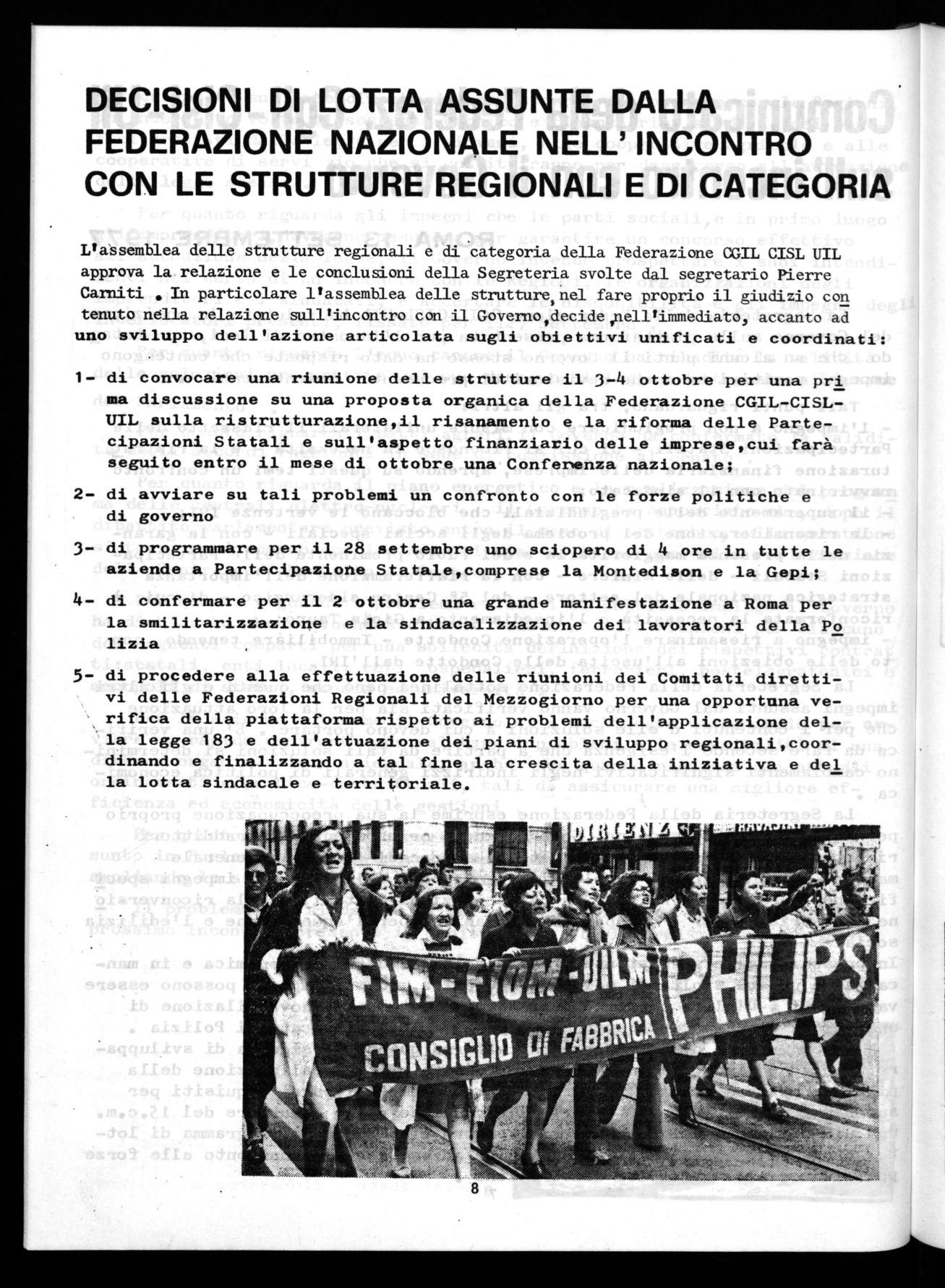 L'assemblea delle strutture regionali e di categoria della Federazione CGIL CISL UIL approva la relazione e le conclusioni della Segreteria svolte dal segretario Pierre Carniti . In particolare l'assemblea delle strutture,nel fare proprio il giudizio con tenuto nella relazione sull'incontro con il Governo,decide,nell'immediato, accanto ad uno sviluppo dell'azione articolata sugli obiettivi unificati e coordinati: