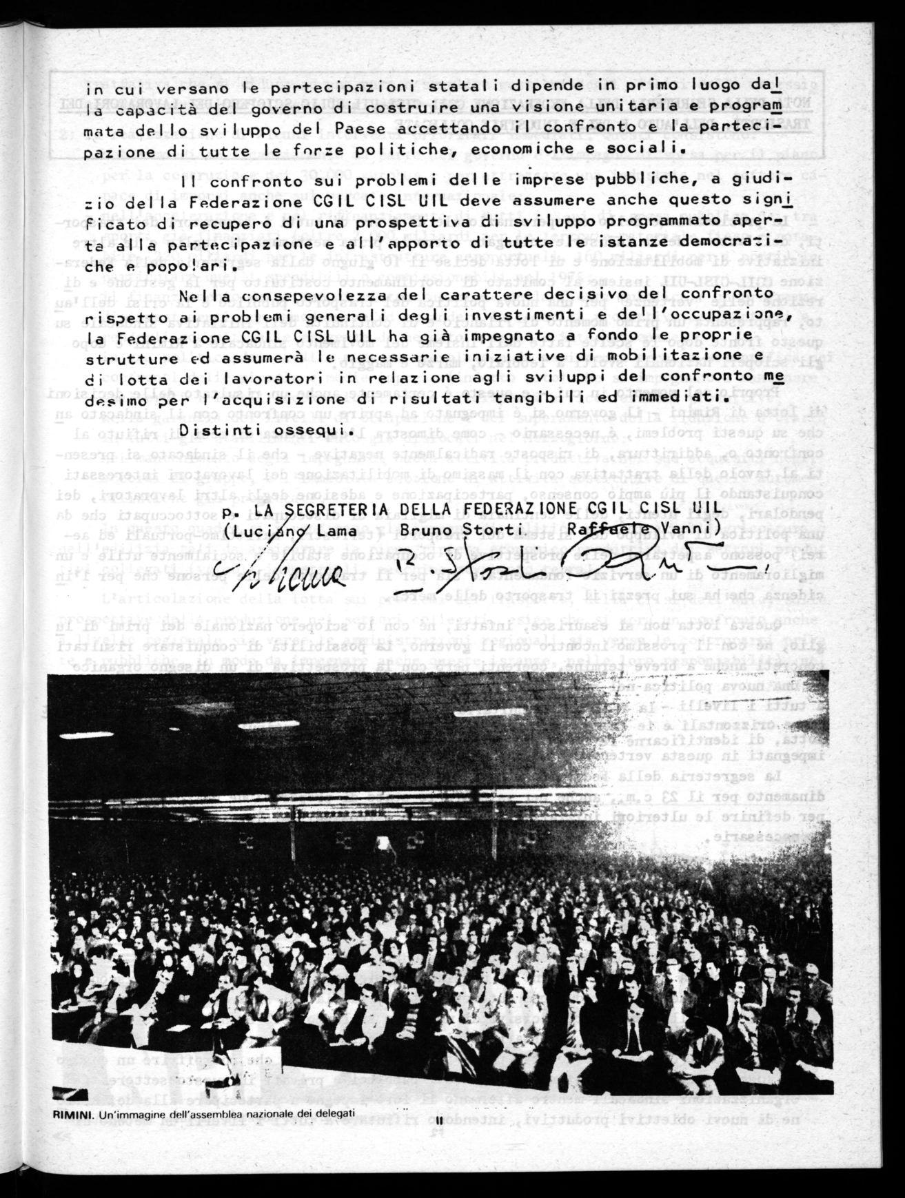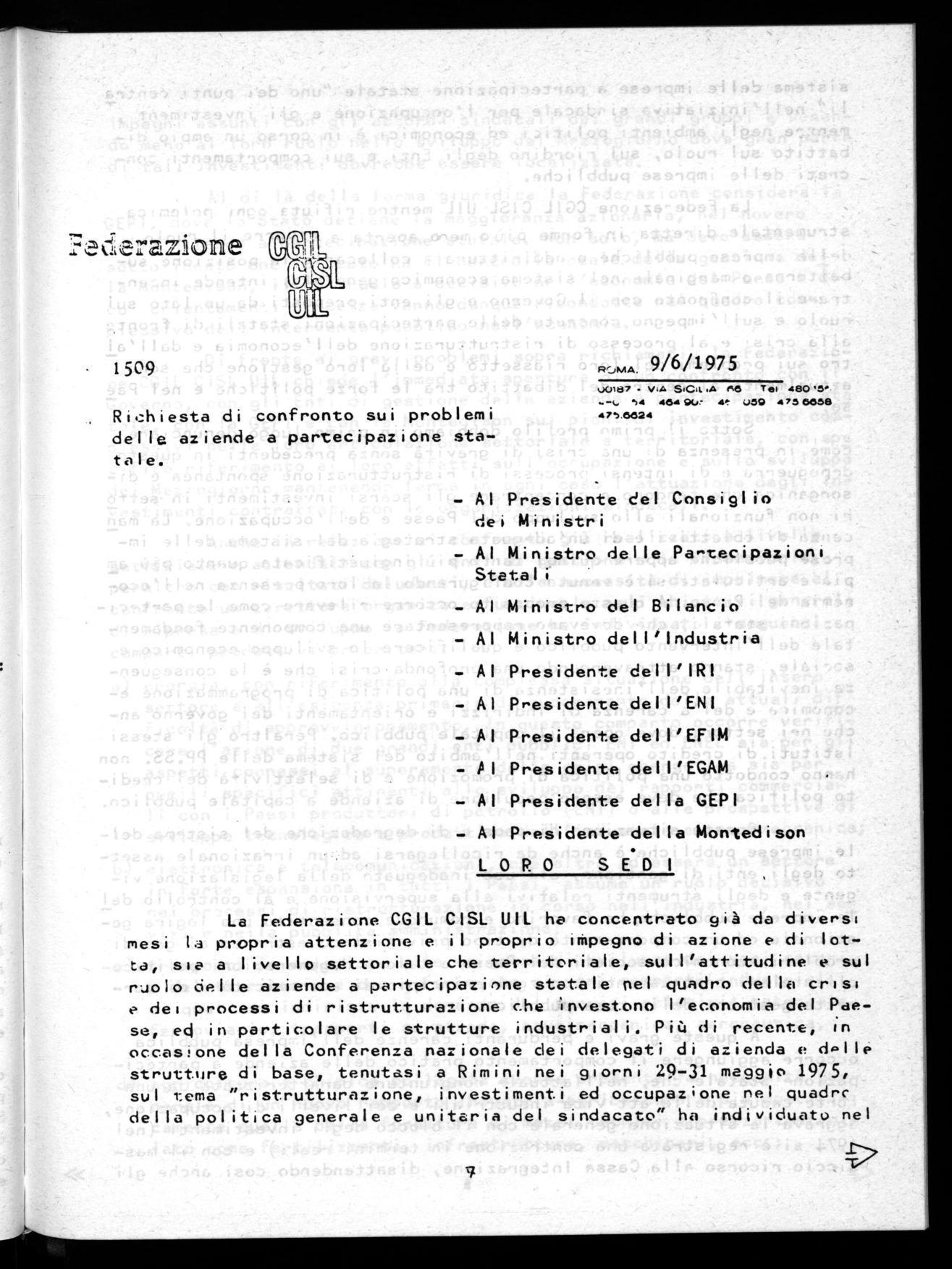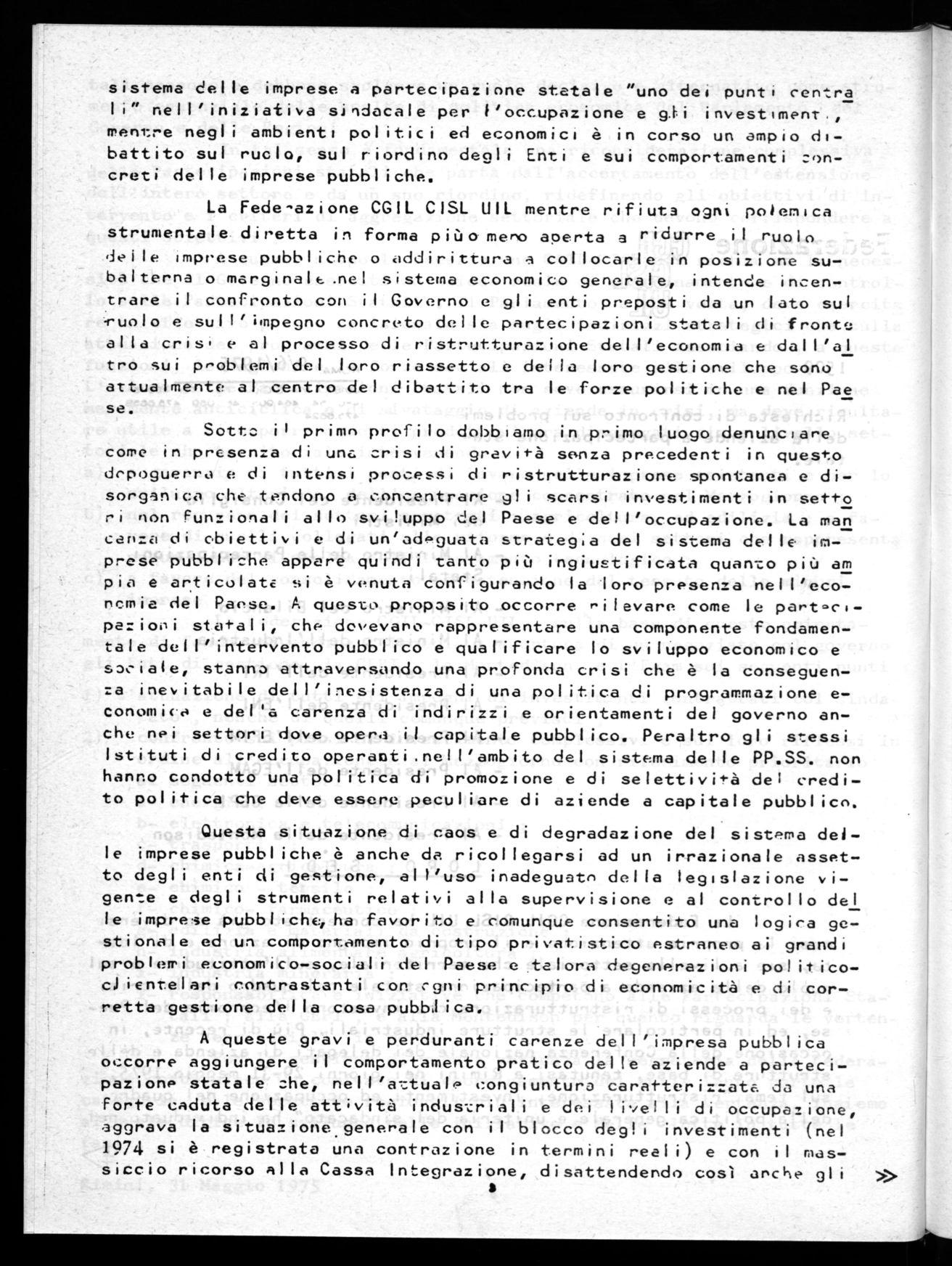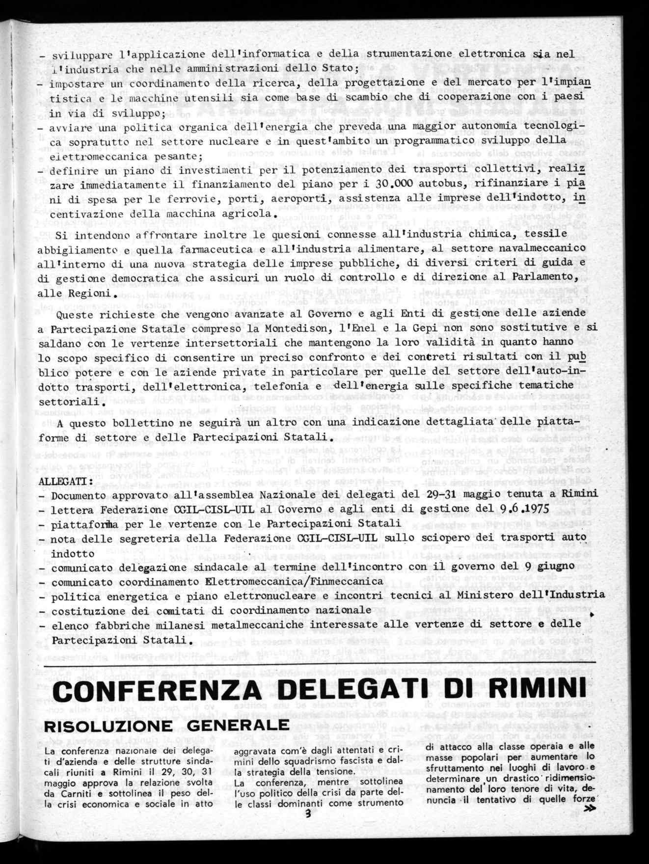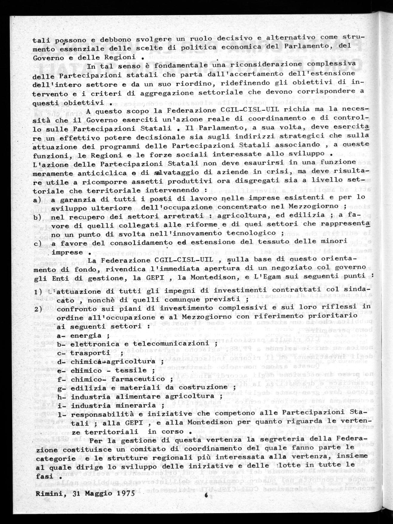 - Documento approvato all'assemblea Nazionale dei delegati del 29-31 maggio tenuta a Rimini lettera Federazione CGIL-CISL-UIL al Governo e agli enti di gestione del 9.6.1975 piattaforffla per le vertenze con le Partecipazioni Statali