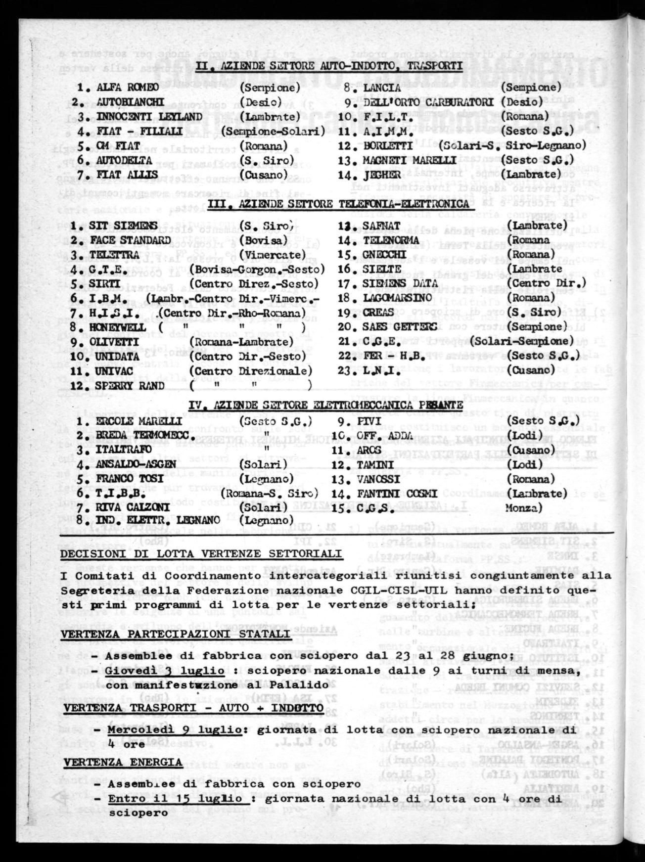 - elenco fabbriche milanesi metalmeccaniche interessate alle vertenze di settore e delle Partecipazioni Statali.