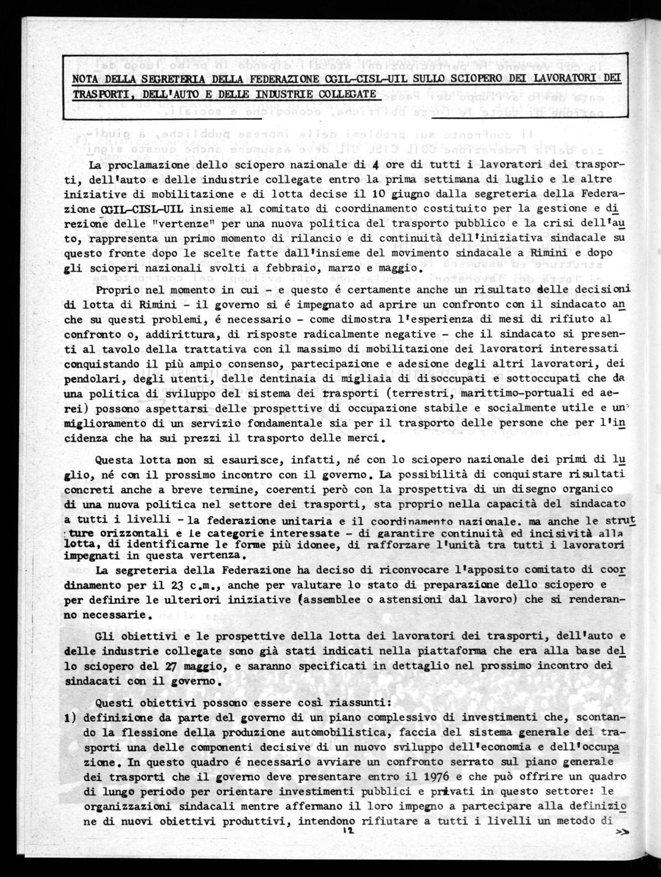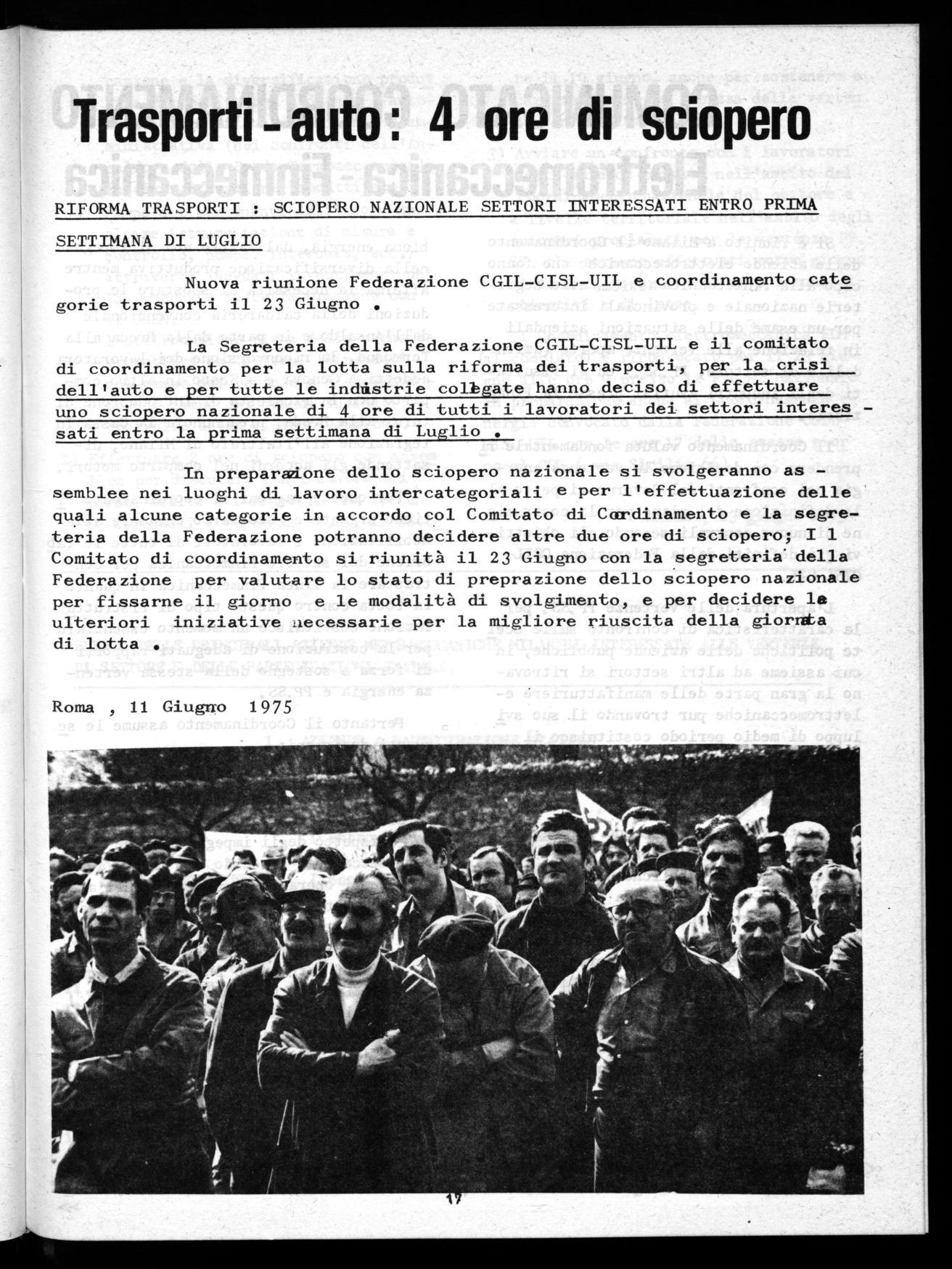 La Segreteria della Federazione CGIL-CISL-UIL e il comitato di coordinamento per la lotta sulla riforma dei trasporti, per la crisi dell'auto e per tutte le industrie colbgate hanno deciso di effettuare uno sciopero nazionale d 4 ore di tutti i lavoratori dei settori interes sati entro la prima settimana di Luglio .