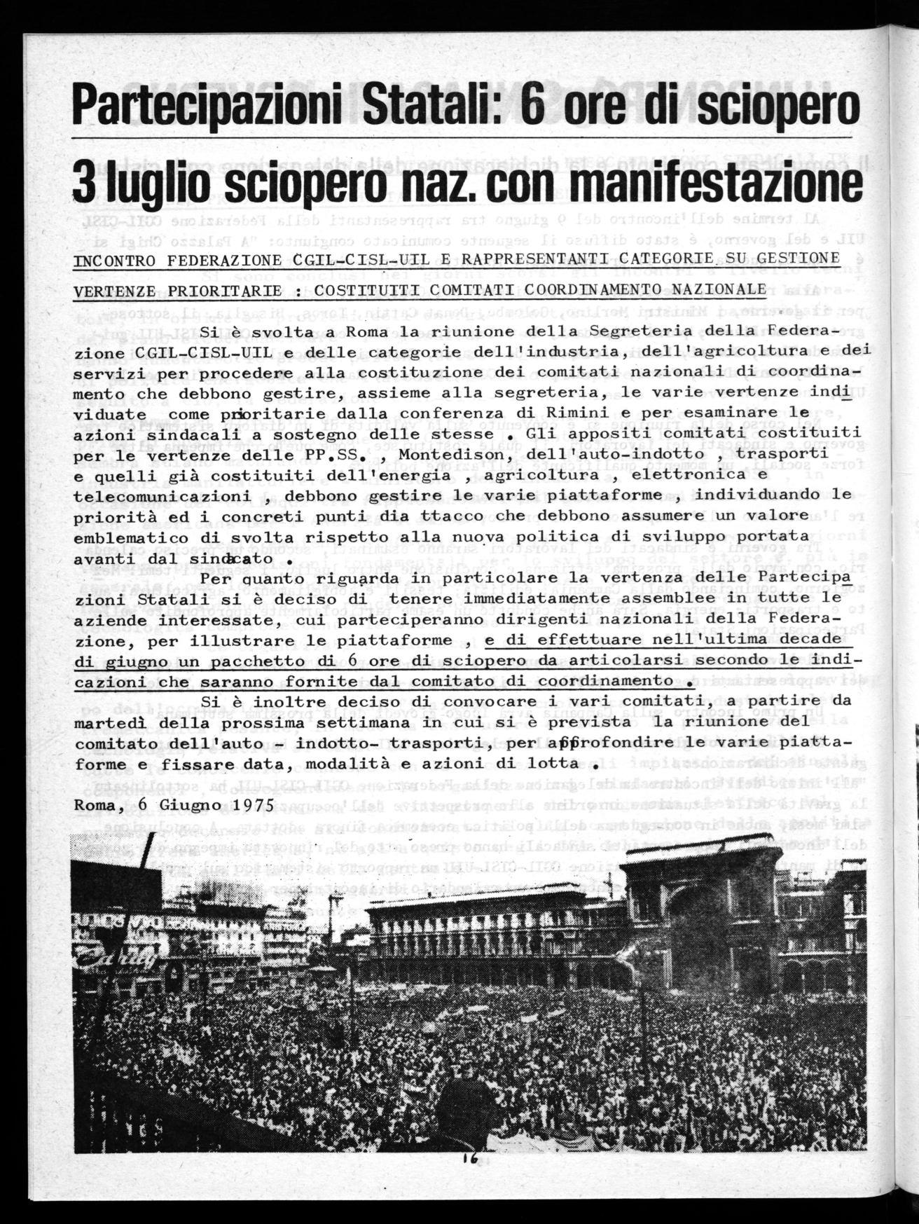 Partecipazioni Statali: 6 ore di sciopero 3 luglio sciopero naz. con manifestazione