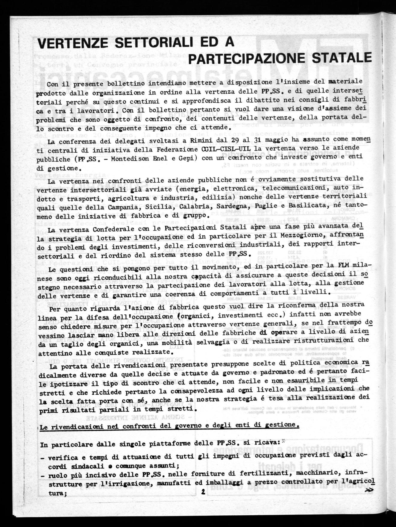 L'apertura delle vertenze PP.SS. per la caratteristica di confronto sulle scel te politiche delle aziende pubbliche, in cui assieme ad altri settori si ritrovano la gran parte delle manifatturiere elettromeccaniche pur trovando il suo svi luppo di medio periodo costituisce il punto di riferimento a cui finalizzare l'iniziativa sindacale nelle fabbriche e nel settore.