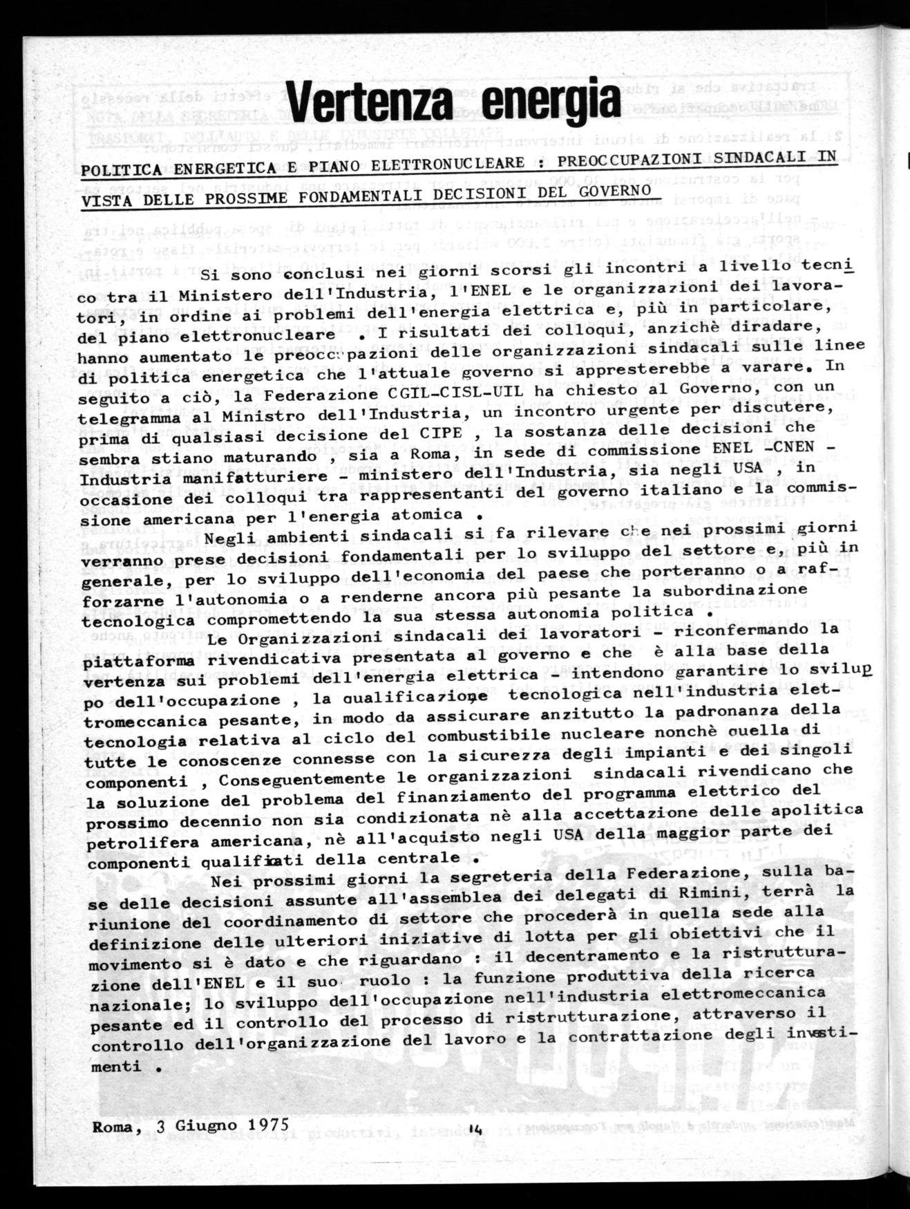 Si sono conclusi nei giorni scorsi gli incontri a livello tecni co tra il Ministero dell'Industria, l'ENEL e le organizzazioni dei lavoratori, in ordine ai problemi dell'energia elettrica e, più in particolare, del piano elettronucleare . I risultati dei colloqui, anzichè diradare, hanno aumentato le preocc' pazioni delle organizzazioni sindacali sulle linee di politica energetica che l'attuale governo si appresterebbe a varare. In seguito a ciò, la Federazione CGIL-CISL-UIL ha chiesto al Governo, con un telegramma al Ministro dell'Industria, un incontro urgente per discutere, prima di qualsiasi decisione del CIPE , la sostanza delle decisioni che sembra stiano maturando , sia a Roma, in sede di commissione ENEL -CNENIndustria manifatturiere - ministero dell'Industria, sia negli USA , in occasione dei colloqui tra rappresentanti del governo italiano e la commissione americana per l'energia atomica .
