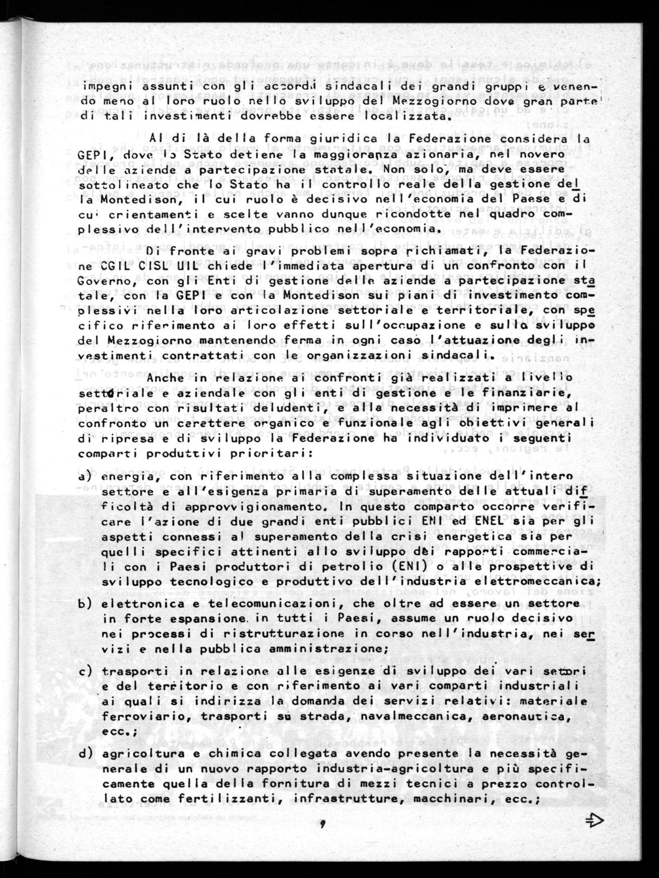 La Federazione CGIL-CISL-UIL, sulla base di ouesto orientamento di fondo, rivendica l'immediata apertura di un negoziato col governo gli Enti di gestione, la GEPI , la Montedison, e L'Egam sui seguenti punti