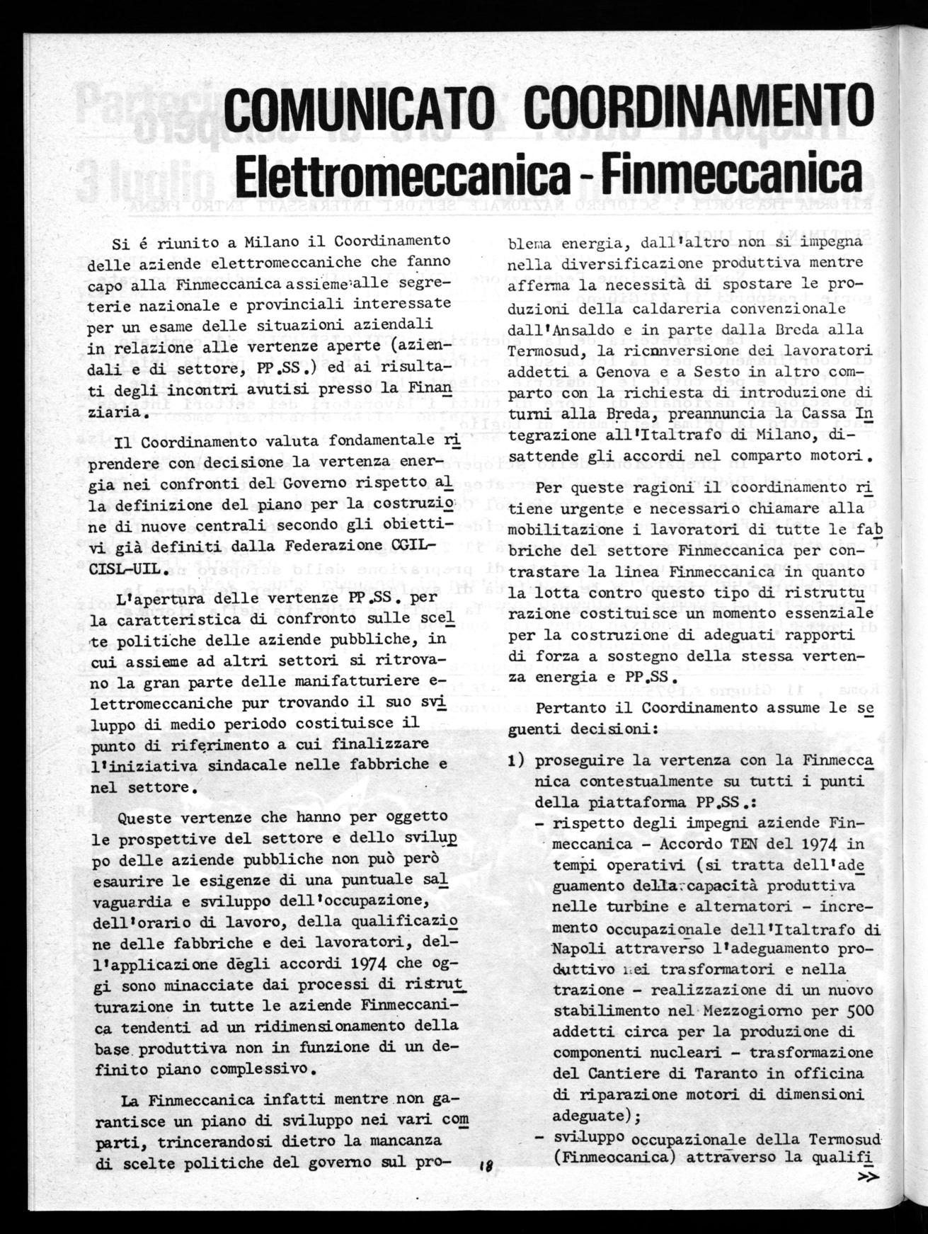 Si é riunito a Milano il Coordinamento delle aziende elettromeccaniche che fanno capo alla Finmeccanicaassiemealle segreterie nazionale e provinciali interessate per un esame delle situazioni aziendali in relazione alle vertenze aperte (aziendali e di settore, PP.SS.) ed ai risultati degli incontri avutisi presso la Finan ziaria.