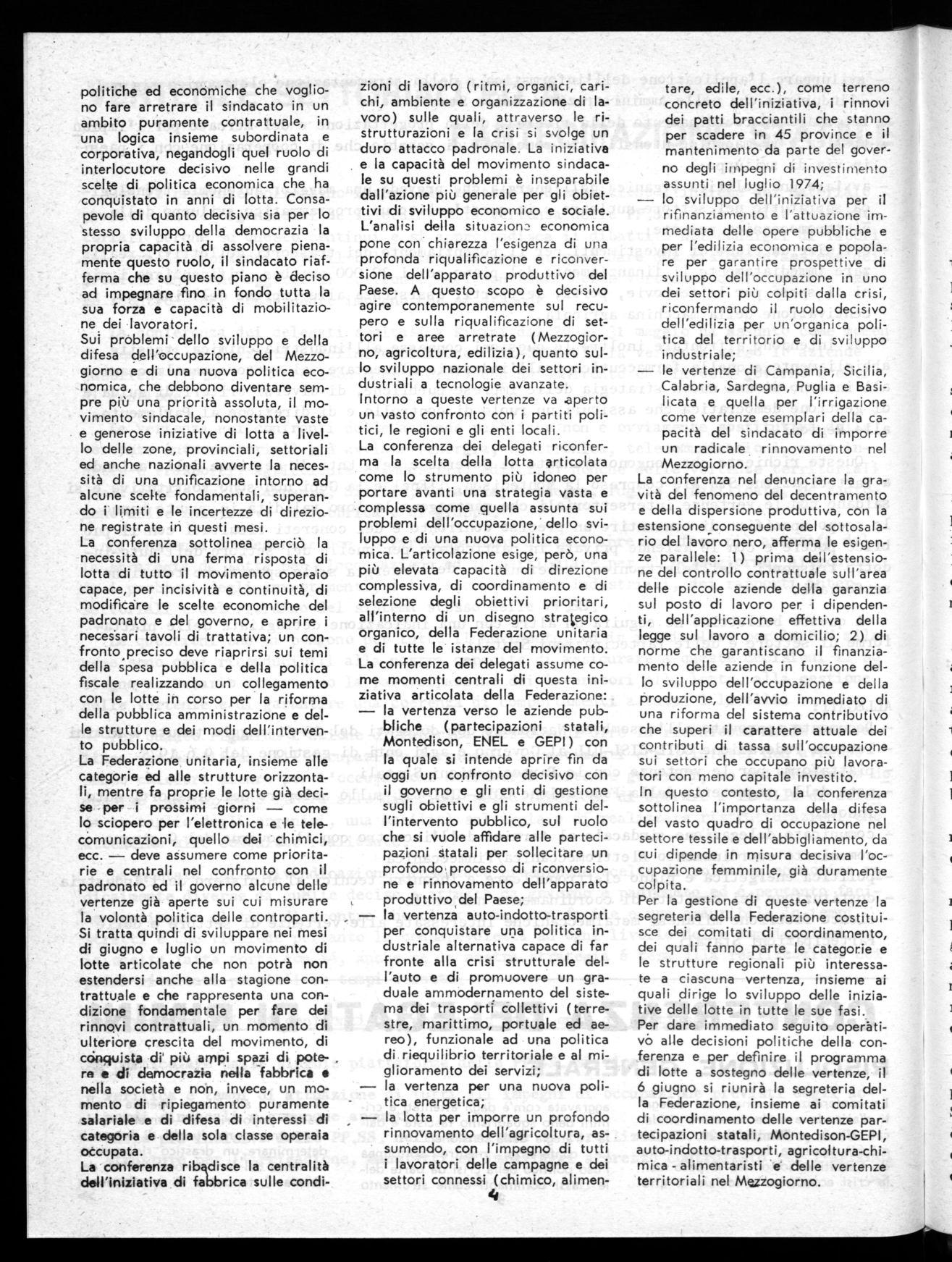 La conferenza dei delegati riconferma la scelta della lotta articolata come lo strumento più idoneo per portare avanti una strategia vasta e complessa come quella assunta sui problemi dell'occupazione, dello sviluppo e di una nuova politica economica. L'articolazione esige, però, una più elevata capacità di direzione complessiva, di coordinamento e di selezione degli obiettivi prioritari, all'interno di un disegno strategico organico, della Federazione unitaria e di tutte le istanze del movimento.