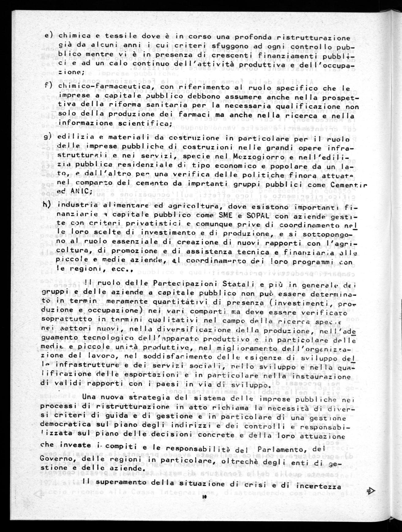 L'azione delle Partecipazioni Statali non deve esaurirsi in una funzione meramente anticiclica e di mIlvataggio di aziende in crisi, ma deve risultare utile a ricomporre assetti produttivi ora disgregati sia a livello settoriale che territoriale intervenendo : a garanzia di tutti i posti di lavoro nelle imprese esistenti e per lo sviluppo ulteriore dell'occupazione concentrato nel Mezzogiorno ; nel recupero dei settori arretrati : agricoltura, ed edilizia ; a favore di quelli collegati alle riforme e di Quei settori che rappresenta no un punto di svolta nell'innovamento tecnologico ; a favore del consolidamento ed estensione del tessuto delle minori imprese .