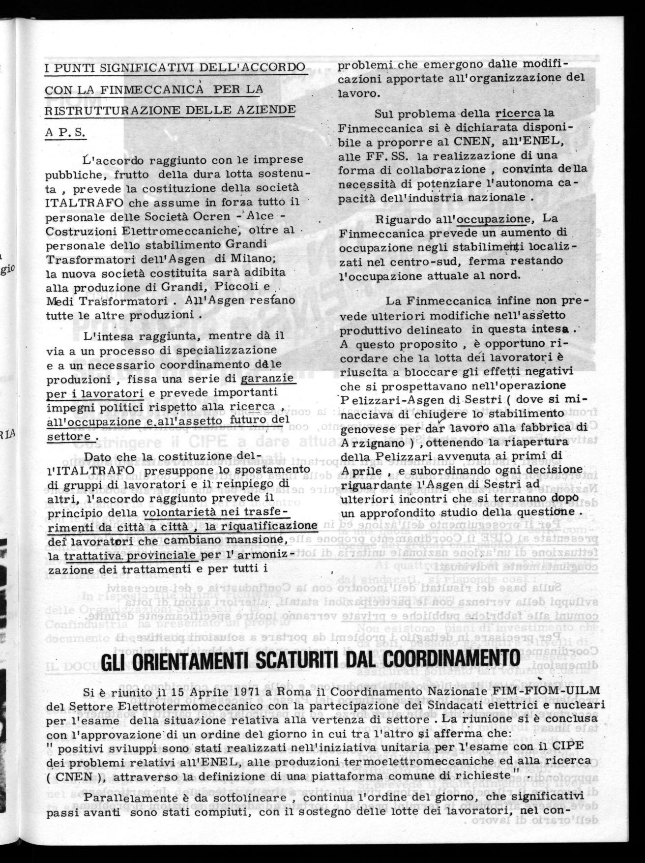 L'accordo raggiunto con le imprese pubbliche, frutto della dura lotta sostenuta , prevede la costituzione della società ITALTR AFO che assume in forza tutto il personale delle Società Ocren -`AlceCostruzioni Elettromeccaniche, oltre al personale dello stabilimento Grandi Trasformatori dell' Asgen di Milano; la nuova società costituita sarà adibita alla produzione di Grandi, Piccoli e Medi Trasformatori . All'Asgen resfano tutte le altre produzioni .
