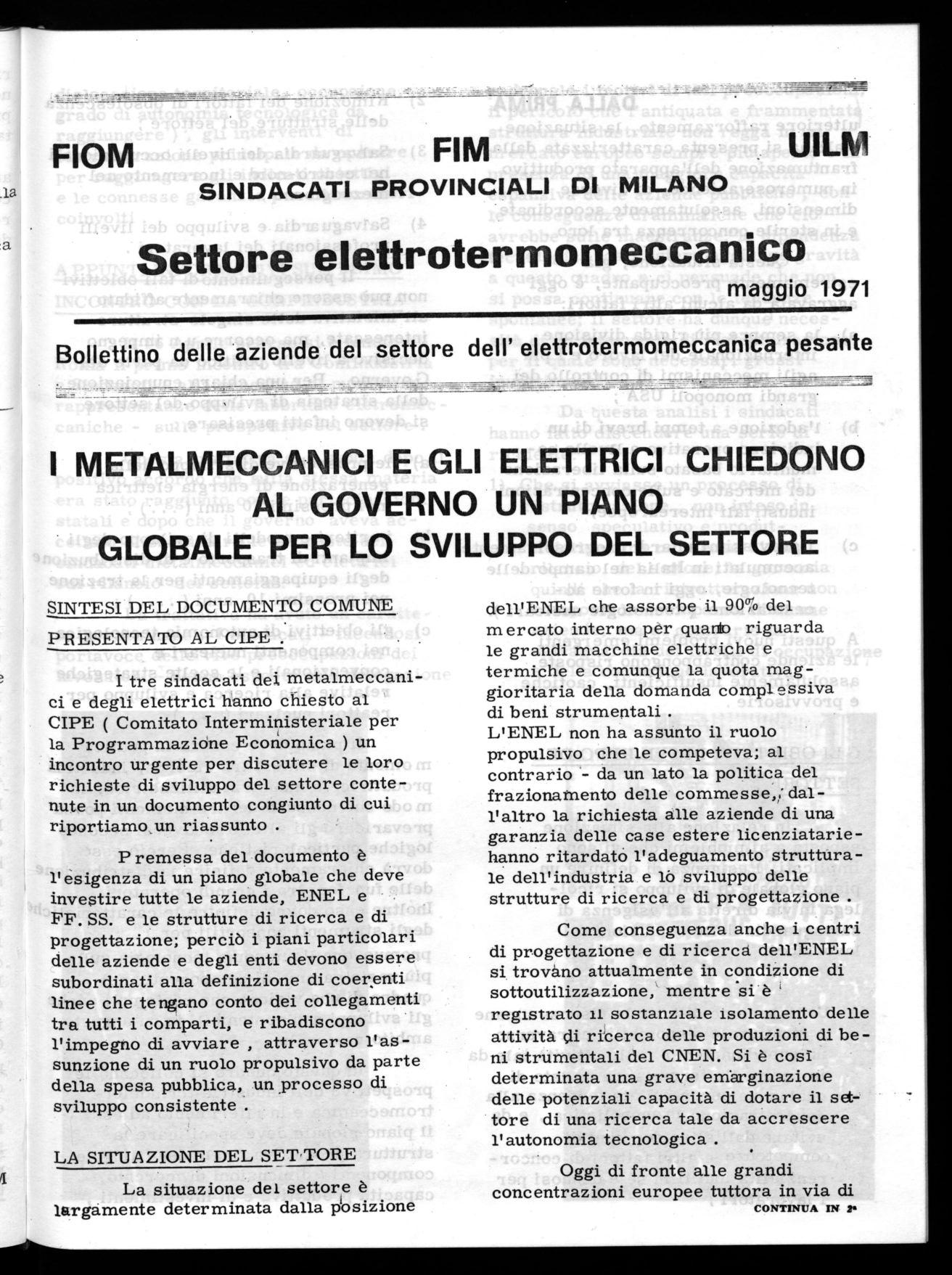 Si è riunito il 15 Aprile 1971 a Roma il Coordinamento Nazionale FIM-FIOM-UILM del Settore Elettrotermomeccanico con la partecipazione dei Sindacati elettrici e nucleari per l'esame della situazione relativa alla vertenza di settore . La riunione si è conclusa con l'approvazione - di un ordine del giorno in cui tra l'altro si afferma che: positivi sviluppi sono stati realizzati nell'iniziativa unitaria per l'esame con il CIPE dei problemi relativi all'ENEL, alle produzioni termoelettromeccaniche ed alla ricerca ( CNEN ), attraverso la definizione di una piattaforma comune di richieste" .