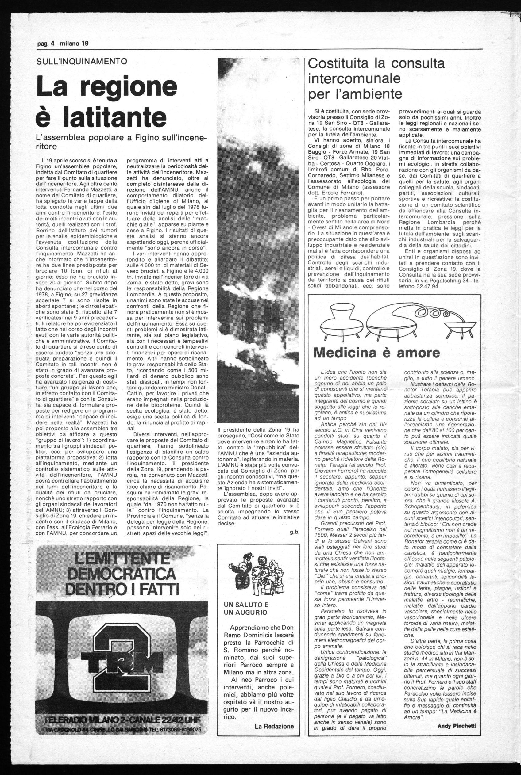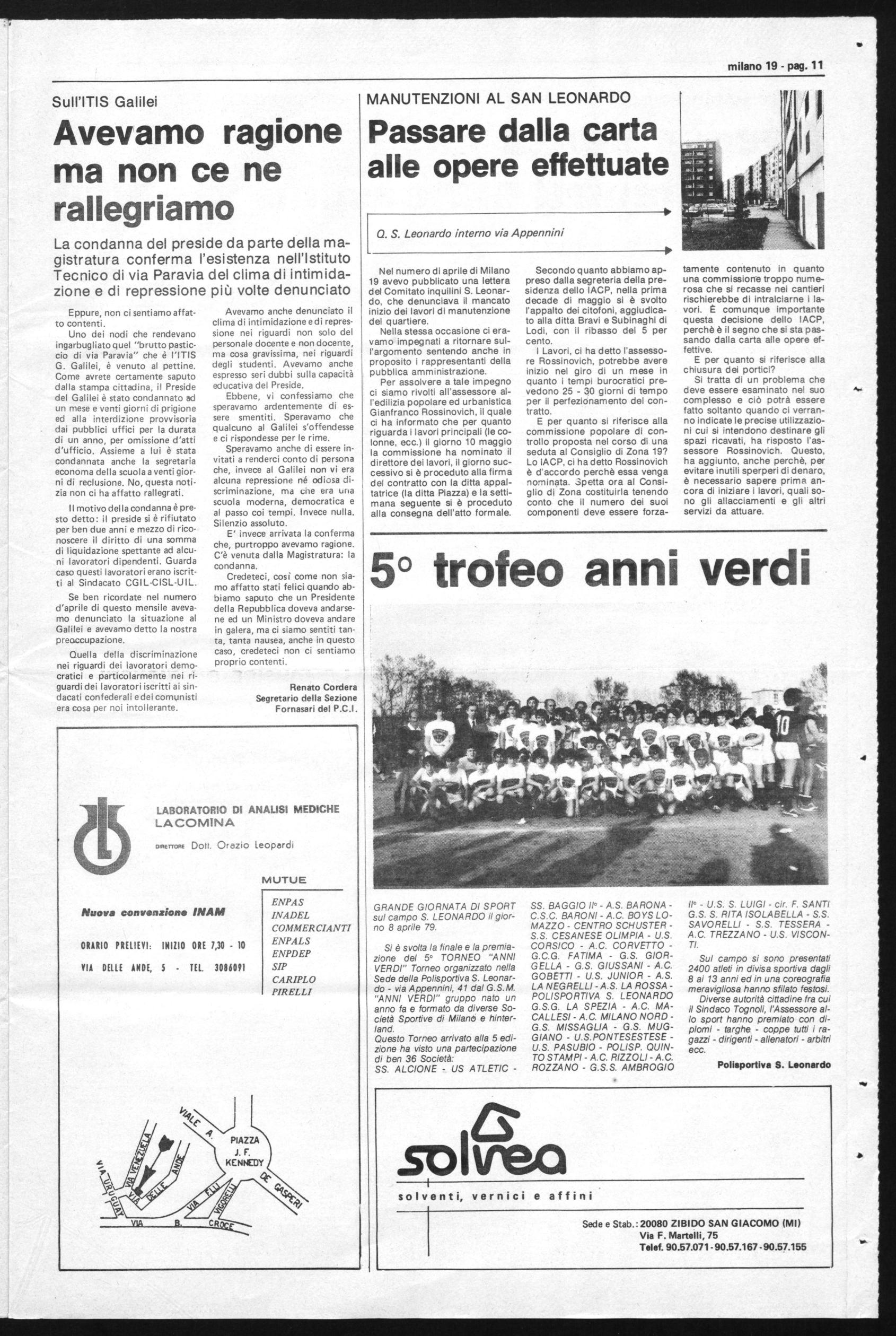 A questo punto, il dato di fondo che interessa tutti i cittadini della Zona 19 è quello della perdita secca di una valida struttura sanitaria sul nostro territorio. È quindi necessario che sorga un vasto movimento per impedire la soppressione di questa struttura sanitaria nella Zona 19; è necessario che le Organizzazioni sindacali dei lavoratori impegnino la proprietà e la Regione in questo senso, come pure il Consiglio di Zona deve far sentire la sua voce in misura maggiore di quanto è avvenuto nel passato.