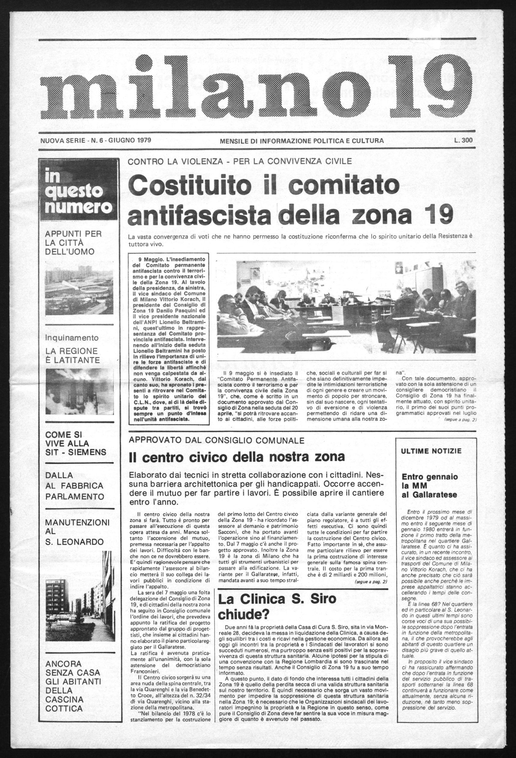 Il 9 maggio si è insediato il "Comitato Permanente Antifascista contro il terrorismo e per la convivenza civile della Zona 19", che, come è scritto in un documento approvato dal Consiglio di Zona nella seduta del 20 aprile, "si potrà ritrovare accanto ai cittadini, alle forze politi-