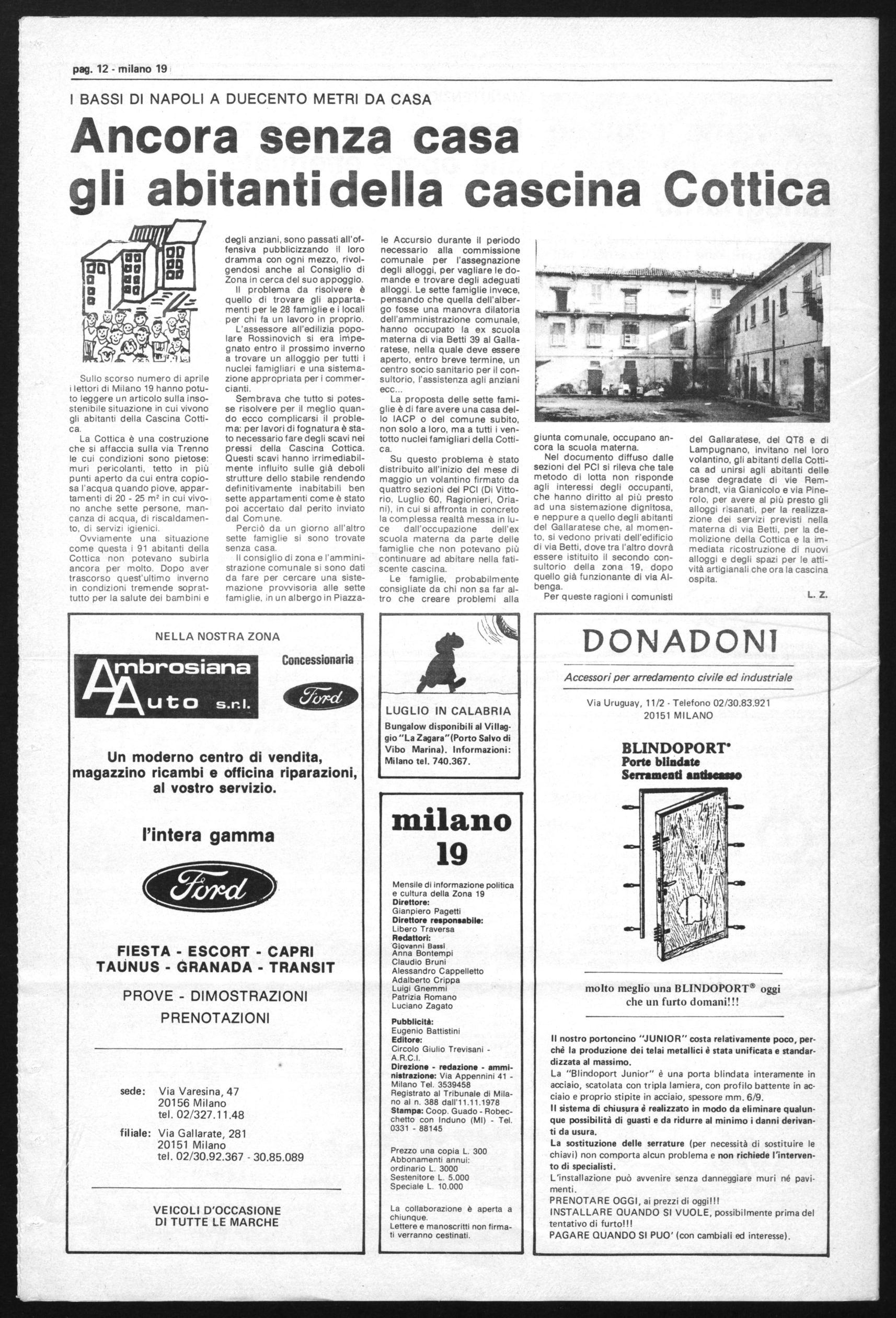 del Gallaratese, del QT8 e di Lampugnano, invitano nel loro volantino, gli abitanti della Cottica ad unirsi agli abitanti delle case degradate di vie Rembrandt, via Gianicolo e via Pinerolo, per avere al più presto gli alloggi risanati, per la realizzazione dei servizi previsti nella materna di via Betti, per la demolizione della Cottica e la immediata ricostruzione di nuovi alloggi e degli spazi per le attività artigianali che ora la cascina ospita.
