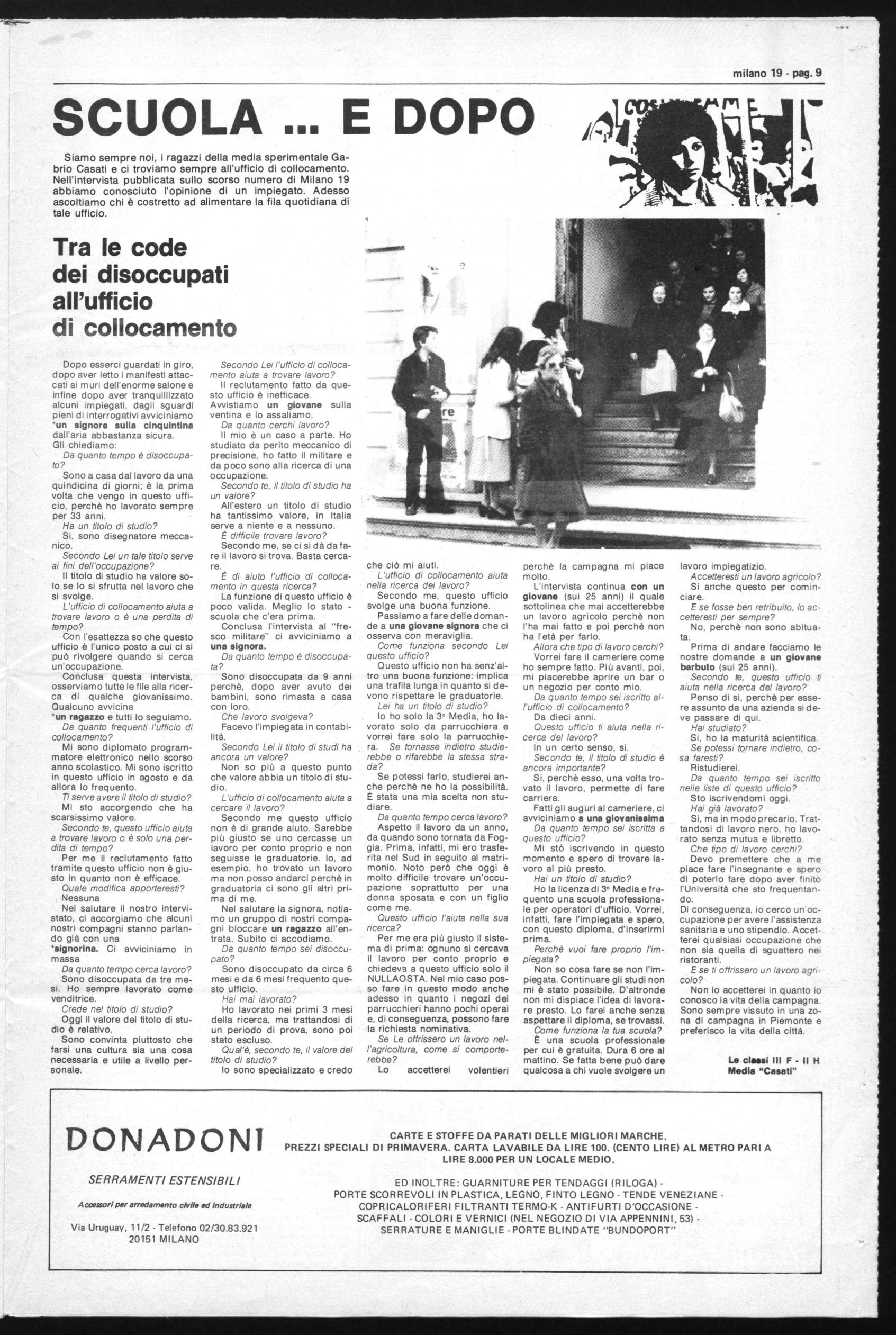 3 - Milano è ormai non molto diversa da altre megalopoli del mondo occidentale o dei paesi cosidetti emancipati: Centro direzionale e Gallaratese; Piazza Duomo e Quarto Oggiaro: sempre una moltitudine di uomini e donne, giovani ed anziani, in movimento; atti di solidarietà e di violenza che si mescolano (quali hanno più peso?). Problemi sempre uguali in ogni strada od in ogni quartiere. Tematiche ripetute: scuola che non funziona, lavoro che non c'è, casa carissima, la macchina, la moto, il "mangiare" che è sempre più caro. le scarpe, l'austerità, il bisogno, la pensione sociale, il movimento, l'unità delle masse; rivoluzione o niente?