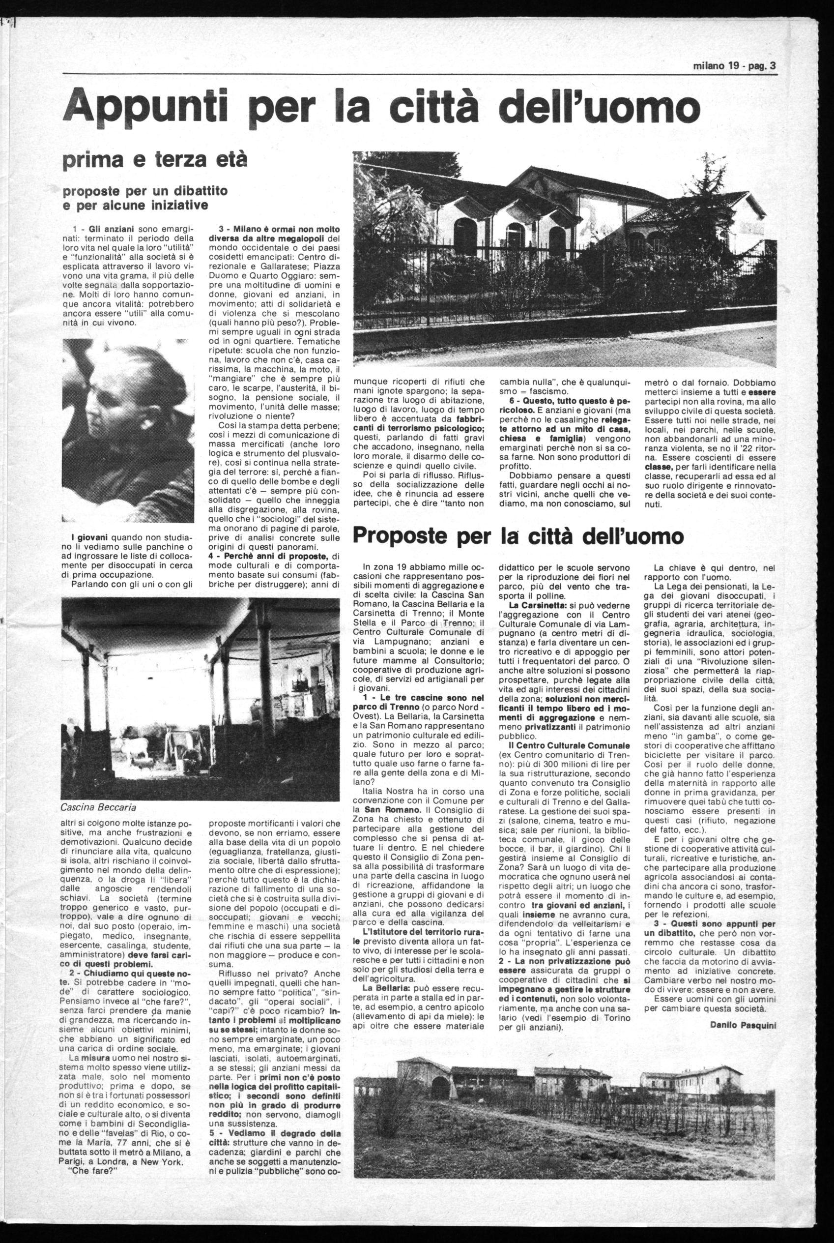 In zona 19 abbiamo mille occasioni che rappresentano possibili momenti di aggregazione e di scelta civile: la Cascina San Romano, la Cascina Bellaria e la Carsinetta di Trenno; il Monte Stella e il Parco di Trenno; il Centro Culturale Comunale di via Lampugnano; anziani e bambini a scuola; le donne e le future mamme al Consultorio; cooperative di produzione agricole, di servizi ed artigianali per i giovani.