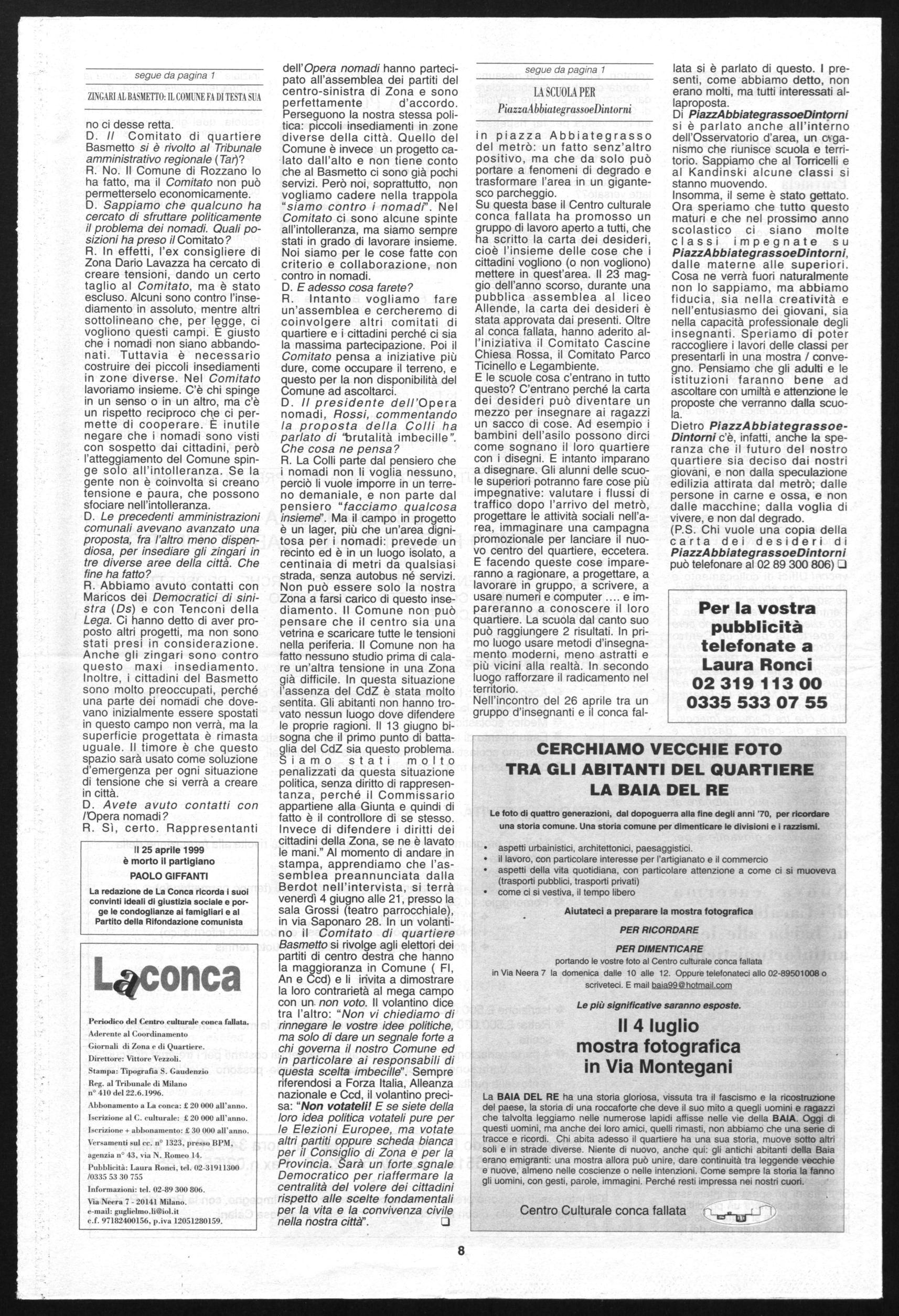R. La Colli parte dal pensiero che i nomadi non li voglia nessuno, perciò li vuole imporre in un terreno demaniale, e non parte dal pensiero "facciamo qualcosa insieme". Ma il campo in progetto è un lager, più che un'area dignitosa per i nomadi: prevede un recinto ed è in un luogo isolato, a centinaia di metri da qualsiasi strada, senza autobus né servizi. Non può essere solo la nostra Zona a farsi carico di questo insediamento. Il Comune non può pensare che il centro sia una vetrina e scaricare tutte le tensioni nella periferia. Il Comune non ha fatto nessuno studio prima di calare un'altra tensione in una Zona già difficile. In questa situazione l'assenza del CdZ è stata molto sentita. Gli abitanti non hanno trovato nessun luogo dove difendere le proprie ragioni. Il 13 giugno bisogna che il primo punto di battaglia del CdZ sia questo problema. Siamo stati molto penalizzati da questa situazione politica, senza diritto di rappresentanza, perché il Commissario appartiene alla Giunta e quindi di fatto è il controllore di se stesso. Invece di difendere i diritti dei cittadini della Zona, se ne è lavato le mani." Al momento di andare in stampa, apprendiamo che l'assemblea preannunciata dalla Berdot nell'intervista, si terrà venerdì 4 giugno alle 21, presso la sala Grossi (teatro parrocchiale), in via Saponaro 28. In un volantino il Comitato di quartiere Basmetto si rivolge agli elettori dei partiti di centro destra che hanno la maggioranza in Comune ( FI, An e Ccd) e li invita a dimostrare la loro contrarietà al mega campo con un non voto. Il volantino dice tra l'altro: "Non vi chiediamo di rinnegare le vostre idee politiche, ma solo di dare un segnale forte a chi governa il nostro Comune ed in particolare ai responsabili di questa scelta imbecille". Sempre riferendosi a Forza Italia, Alleanza nazionale e Ccd, il volantino precisa: "Non votateli! E se siete della loro idea politica votateli pure per le Elezioni Europee, ma votate altri partiti oppure scheda bianca per il Consiglio di Zona e per la Provincia. Sarà un forte sgnale Democratico per riaffermare la centralità del volere dei cittadini rispetto alle scelte fondamentali per la vita e la convivenza civile nella nostra città".