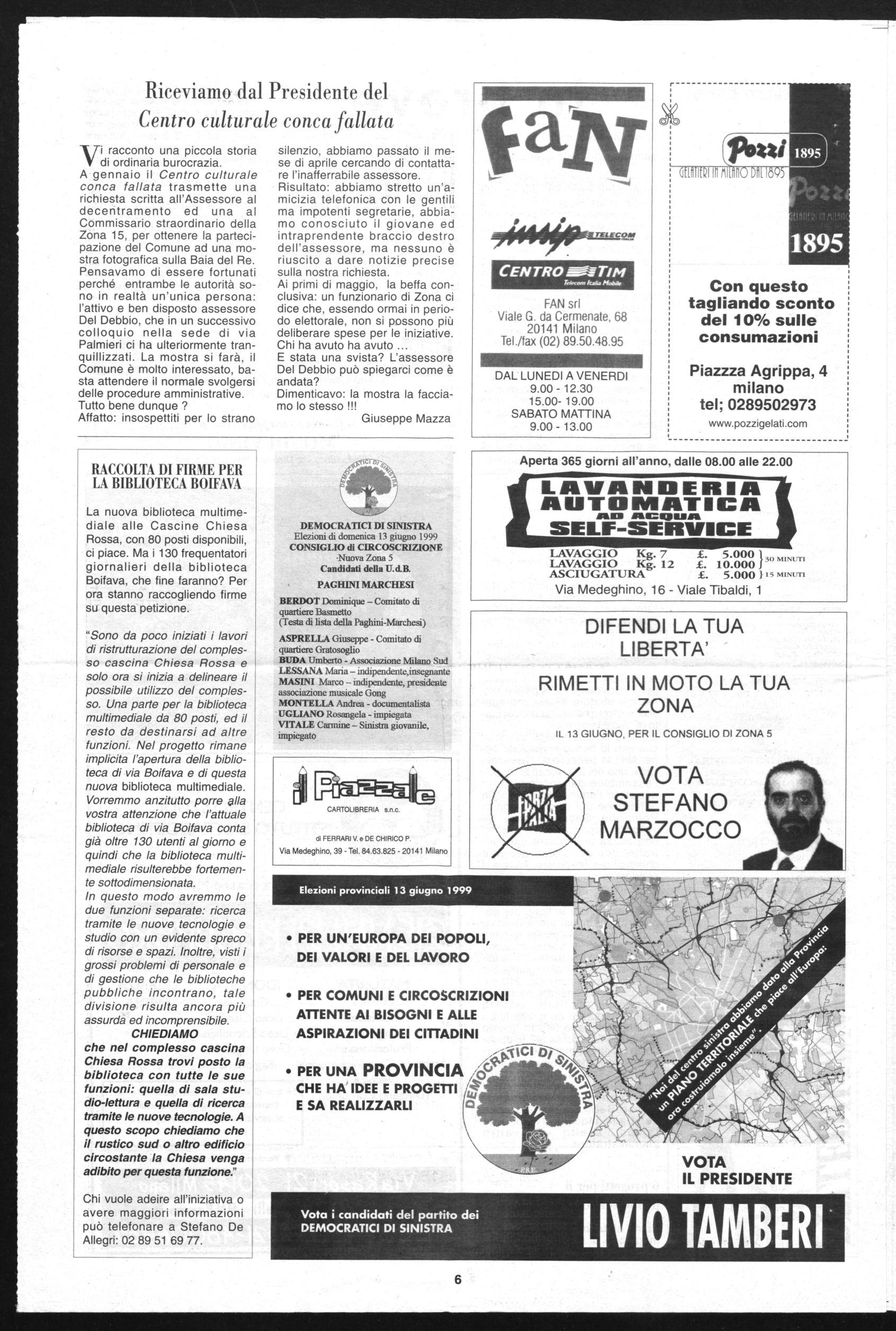tempestiva dei singoli spazi. Grossi propone di costituire un tavolo per definire al più presto un piano di utilizzo generale. Al tavolo dovrebbero partecipare, da una parte il Comune con un coordinatore generale che possa riferire sull'intero complesso, e dall'altra le associazioni ed i cittadini di Zona.Durante la discussione è stato inoltre notato che la Sovrintendenza ai beni ambientali non ha ancora approvato il progetto per la ristrutturazione della Chiesa Rossa: il fatto che nessun rappresentante fosse presente ci ha impedito di conoscere le motivazioni precise e lo stato della relativa prafica.