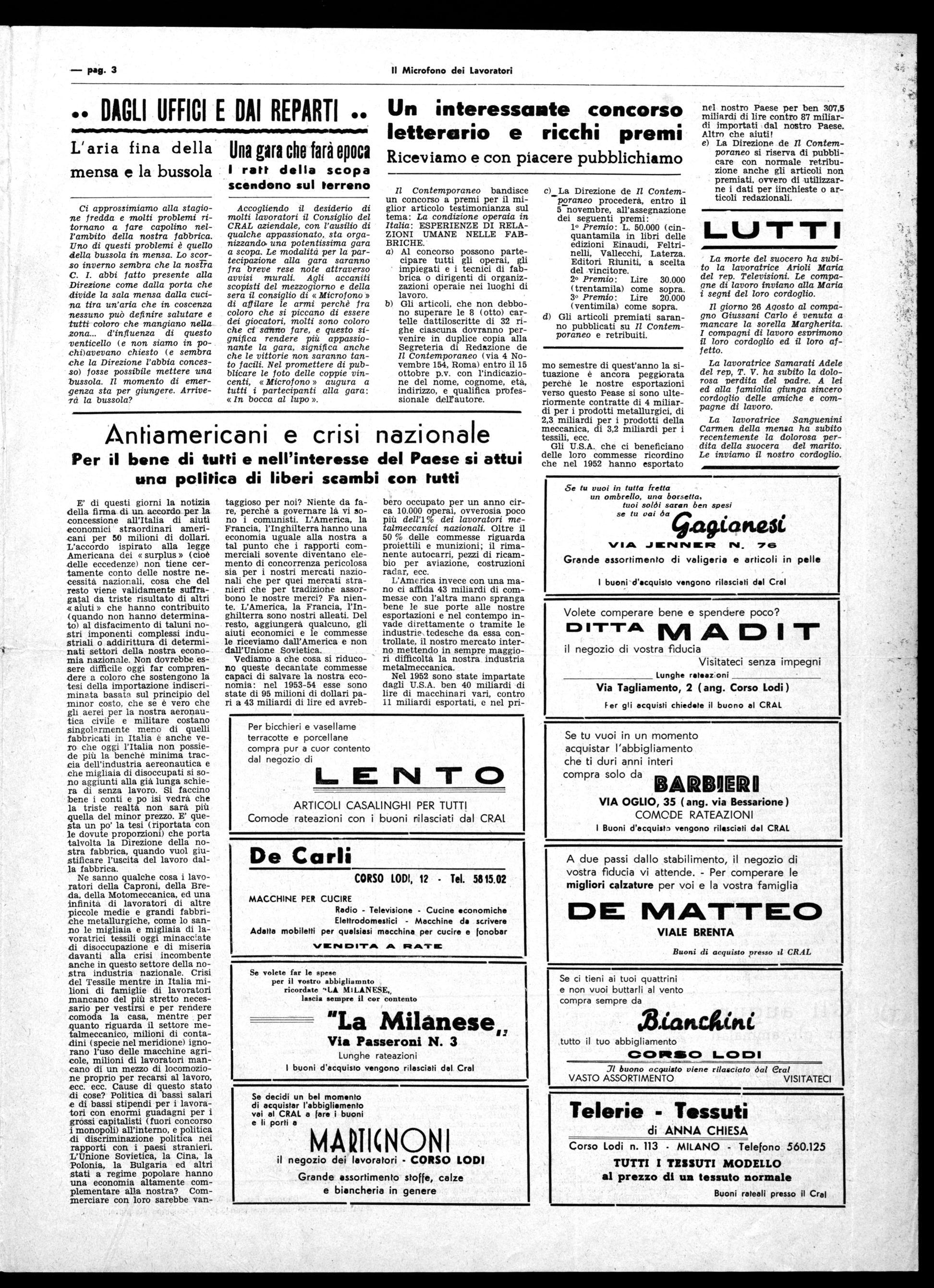 Al Festiva! dell' UNITA' Anche quest'anno il nostro giornale aziendale è stato invitato a partecipare al Festival del giornale « Unità », e come lo scorso anno il « Microfono » ha riscosso gli elogi ed i complimenti di molti visitatori che lungamente ed in numero considerevole si sono trattenuti ad ammirare il nostro bel televisore seguendo con interesse le vicende delle trasmissioni. Assieme al nostro giornale, nel villaggio appositivamente allestito, facevano bella mostra giornali di altre fabbriche che come il nostro trattano i problemi dei lavoratori, siano essi generali che di azienda, dando la misura della evoluzione e maturità in cui è giunta la classe lavoratrice che oggi sa discutere valutare, trattare i suoi problemi dando indirizzi precisi per la loro realizzazione. Quella della stampa operaia e lavoratrice è una conquista che molti ancora oggi sottovalutano; una realtà viva ed operante che qualcuno vorrebbe ignorare. Stava a tutti noi farne uno strumento unitario sempre più valido capace di portare un contributo determinante nella lotta per il progresso sociale e la libertà.
