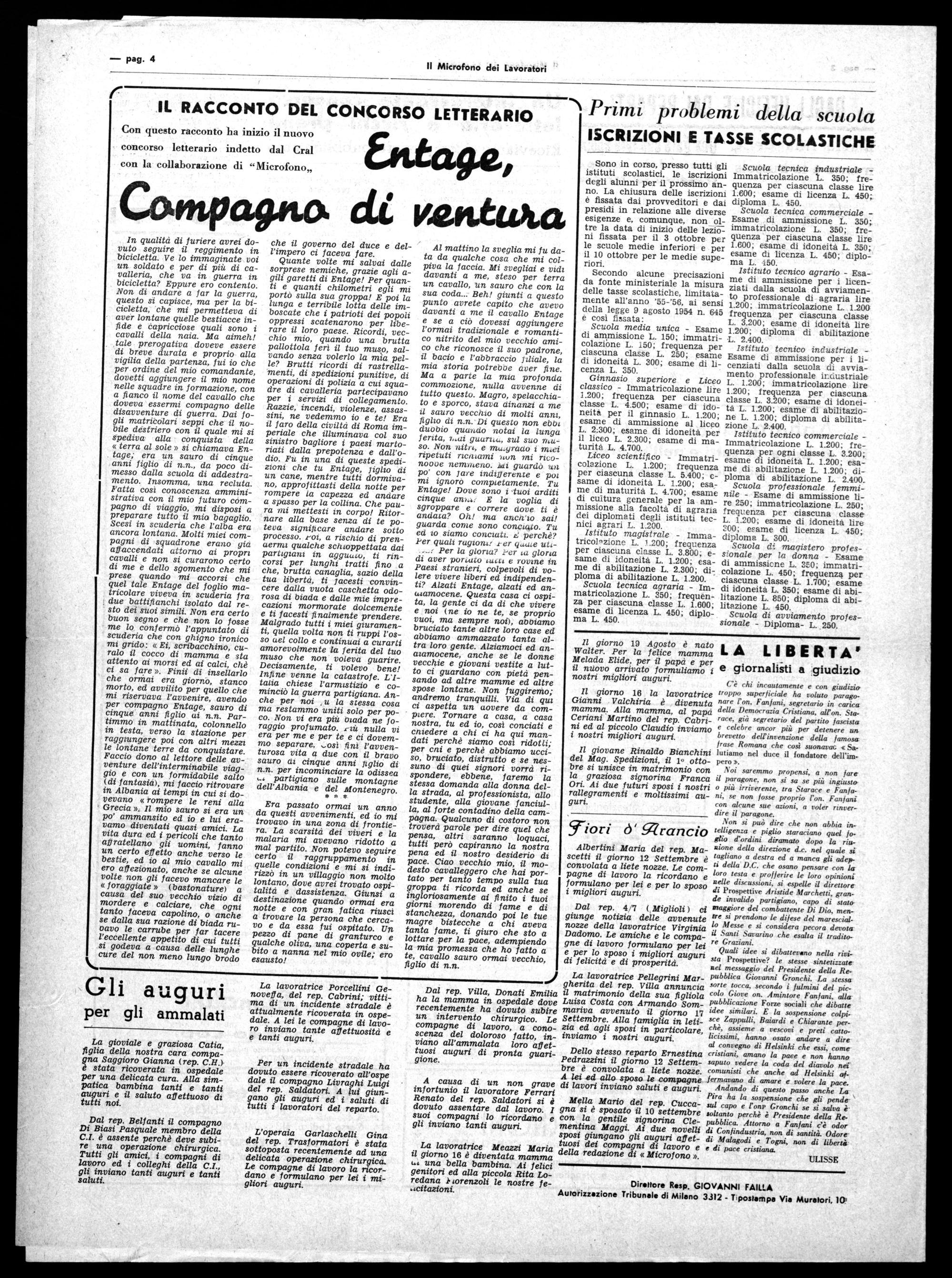 Quali idee si dibattevano nella rividi felicita e di prosperità. sta Prospettive? le stesse sintetizzate nel messaggio del Presidente della ReLa lavoratrice Pellegrini Mar- pubblica Giovanni Gronchi. La stessa gherita del rep. Villa annuncia sorte tocca, secondo i fulmini del picil matrimonio della sua figliola colo Giove on. Amintore Fanfani, alla Luisa Costa con Armando Som- pubblicazione Forze sociali che dibatte mariva avvenuto il giorno 17 idee similari. E la sospensione colpiSettembre. Alla famiglia in le ti- sce Zappulli, Baiardi e Chiarante perzia ed agli sposi in particolare, chè, assieme a vescovi e preti cattoinviamo i nostri auguri. licissimi, hanno osato andare a dire al convegno di Helsinki che essi. come Dello stesso reparto Ernestina cristiani, amano la pace e non hanno Pedrazzini il giorno 12 Settem- saputo vedere la coda del diavolo nei bre è convolata a liete nozze. comunisti che anche ad Helsinki afA lei ed allo sposo le compagne fermavano di amare e volere la pace. di lavori inviano saluti e auguri. Andando di questo passo anche La Pi ha a sospensione che gli pene Mella Mario del rep. Cucca- salra capo l e l'onP Granchi se si salva d è gna si è sposato il 10 settembre soltanto perchè è Presidente della Recon la gentile signorina Cle- pubblica. Attorno a Fanfani c'è odor mentina Maggi. Ai due novelli di Confindustria, non di santità. Odore sposi giungano gli auguri aff et- di Malagodi e Togni, non di libertà tuosi dei compagni di lavoro e e di pace cristiana. della redazione di «Microfono ». ULISSE