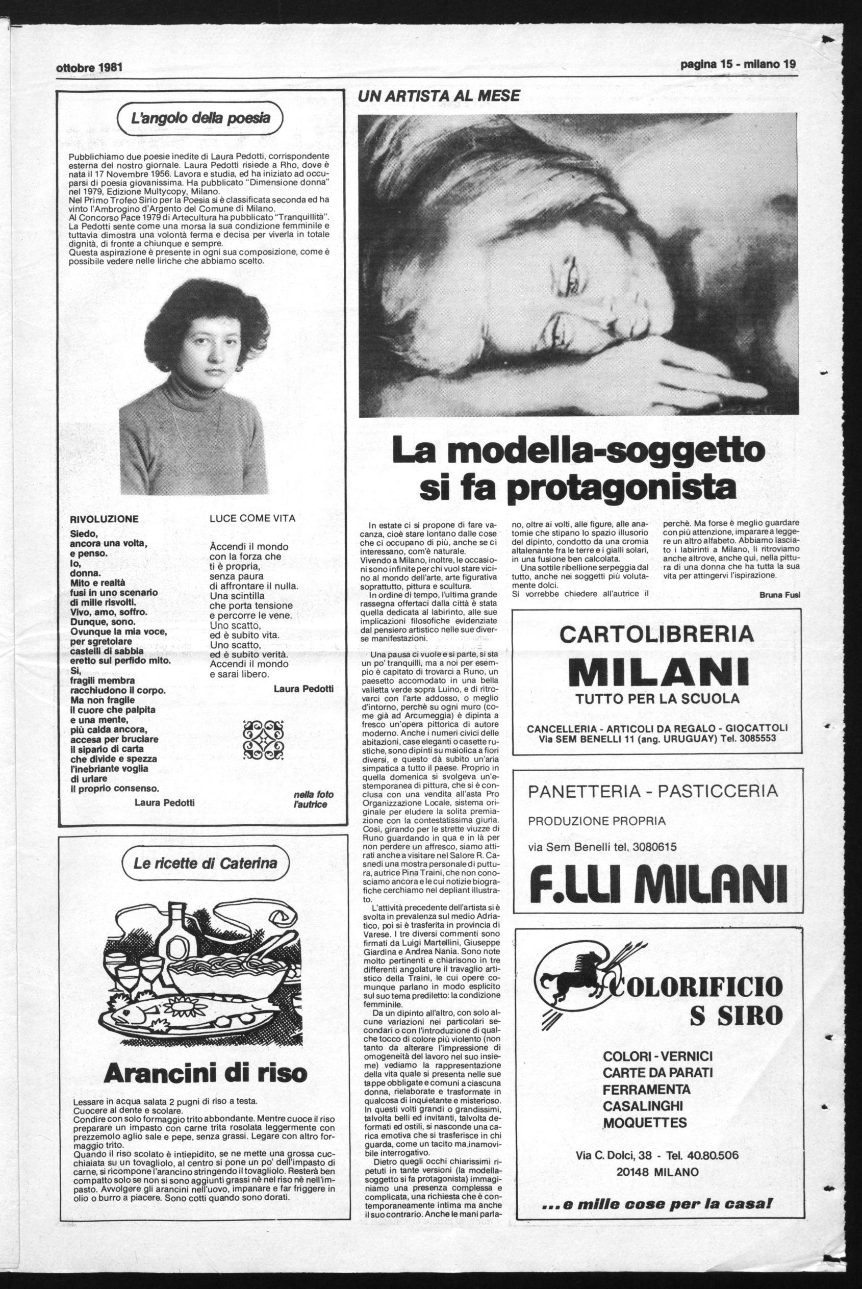 Pubblichiamo due poesie inedite di Laura Pedotti, corrispondente esterna del nostro giornale. Laura Pedotti risiede a Rho, dove è nata il 17 Novembre 1956. Lavora e studia, ed ha iniziato ad occuparsi di poesia giovanissima. Ha pubblicato "Dimensione donna" nel 1979, Edizione Multycopy, Milano.