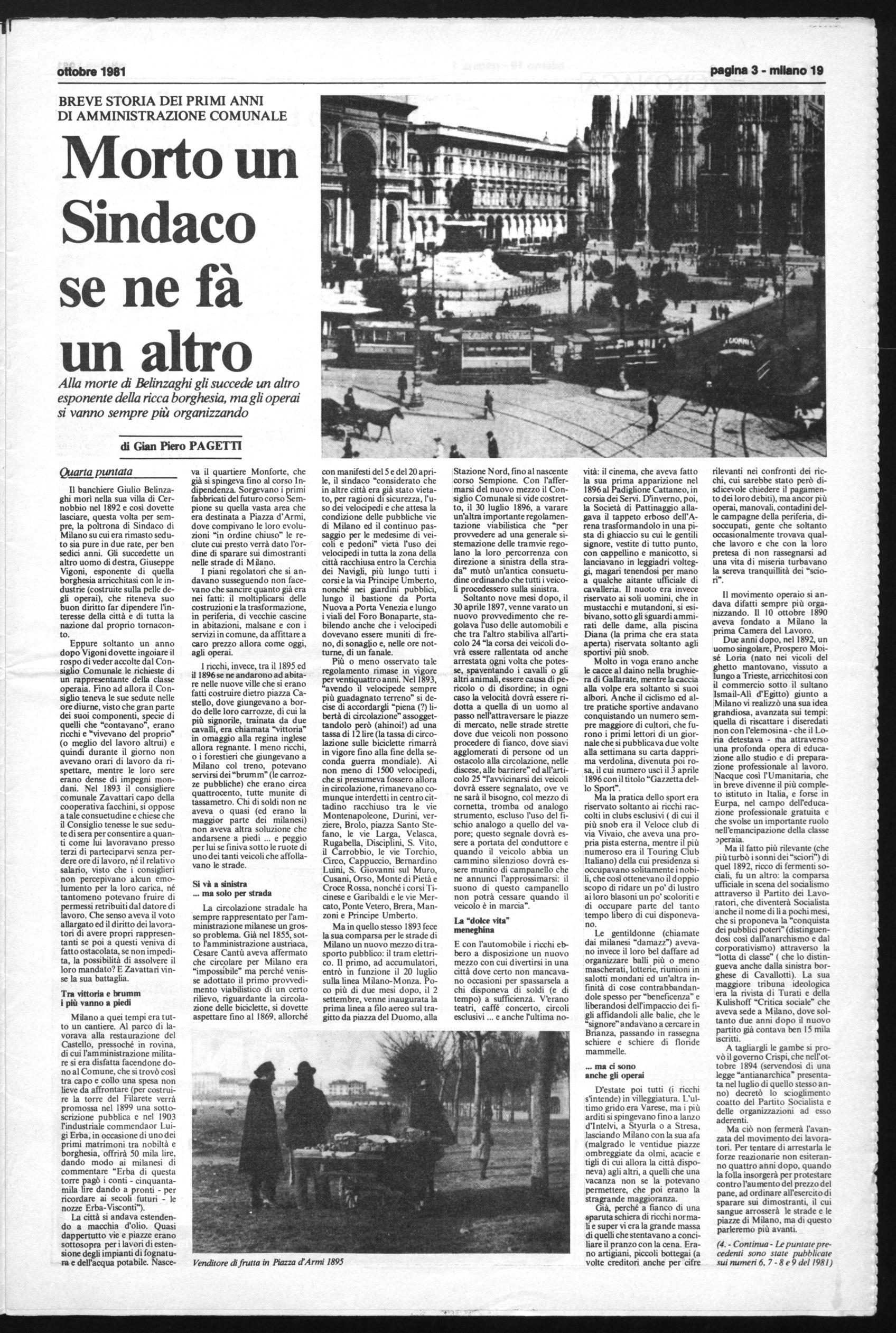 con manifesti del 5 e del 20 aprile, il sindaco "considerato che in altre città era già stato vietato, per ragioni di sicurezza, l'uso dei velocipedi e che attesa la condizione delle pubbliche vie di Milano ed il continuo passaggio per le medesime di veicoli e pedoni" vieta l'uso dei velocipedi in tutta la zona della città racchiusa entro la Cerchia dei Navigli, più lungo tutti i corsie la via Principe Umberto, nonché nei giardini pubblici, lungo il bastione da Porta Nuova a Porta Venezia e lungo i viali del Foro Bonaparte, stabilendo anche che i velocipedi dovevano essere muniti di freno, di sonaglio e, nelle ore notturne, di un fanale.