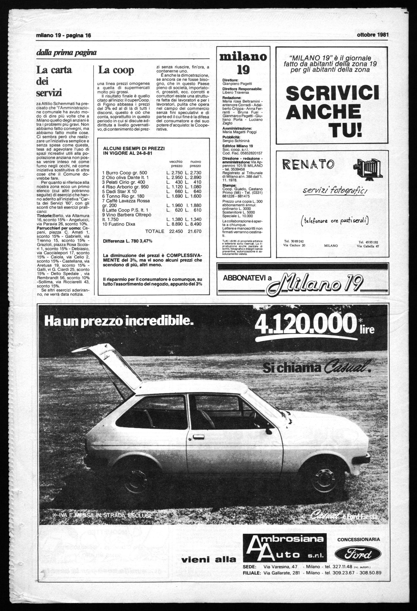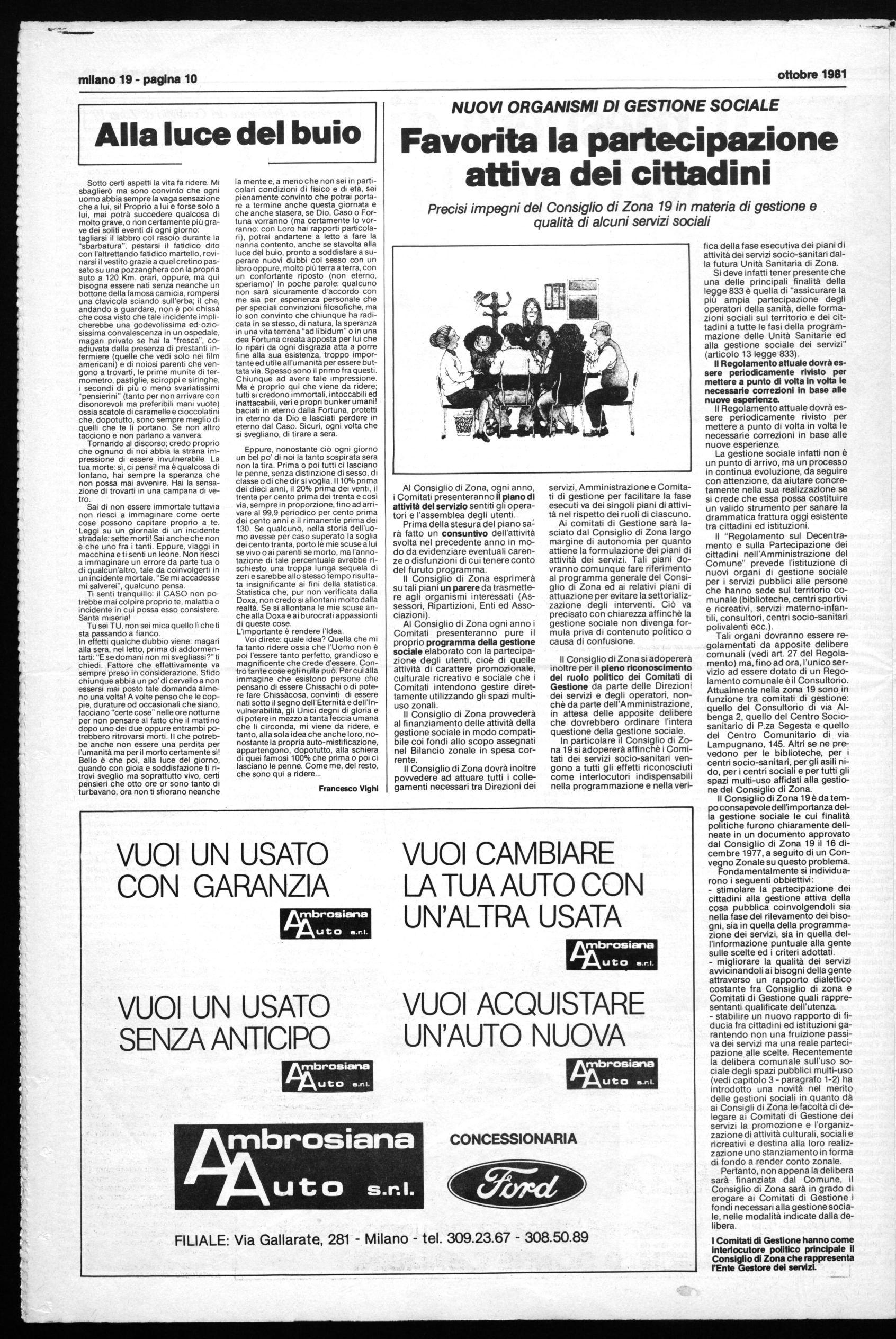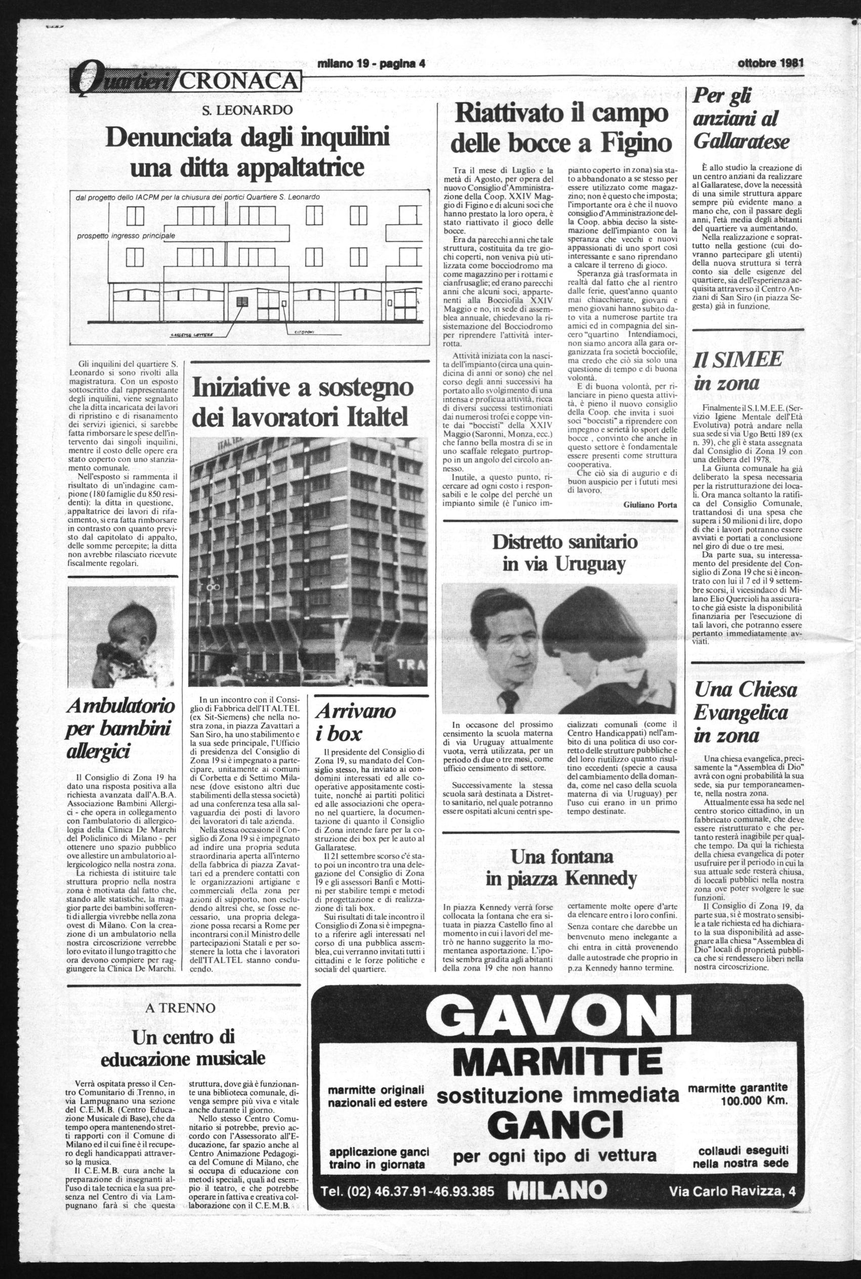 rantiva in prima persona l'imminente inizio dei lavori per la chiusura dei piloty, ma a tutt'oggi, 9 settembre 1981, non si è ancora ricevuto alcuna notizia al riguardo. Oggi tutti vorremmo vedere meglio dentro la città, vorremmo discutere e parlare ma, in modo particolare, vorremmo migliorare questo quartiere desiderandolo più pulito, non solo dalle immondizie, ma anche dalle speculazioni politiche a danno degli abitanti.