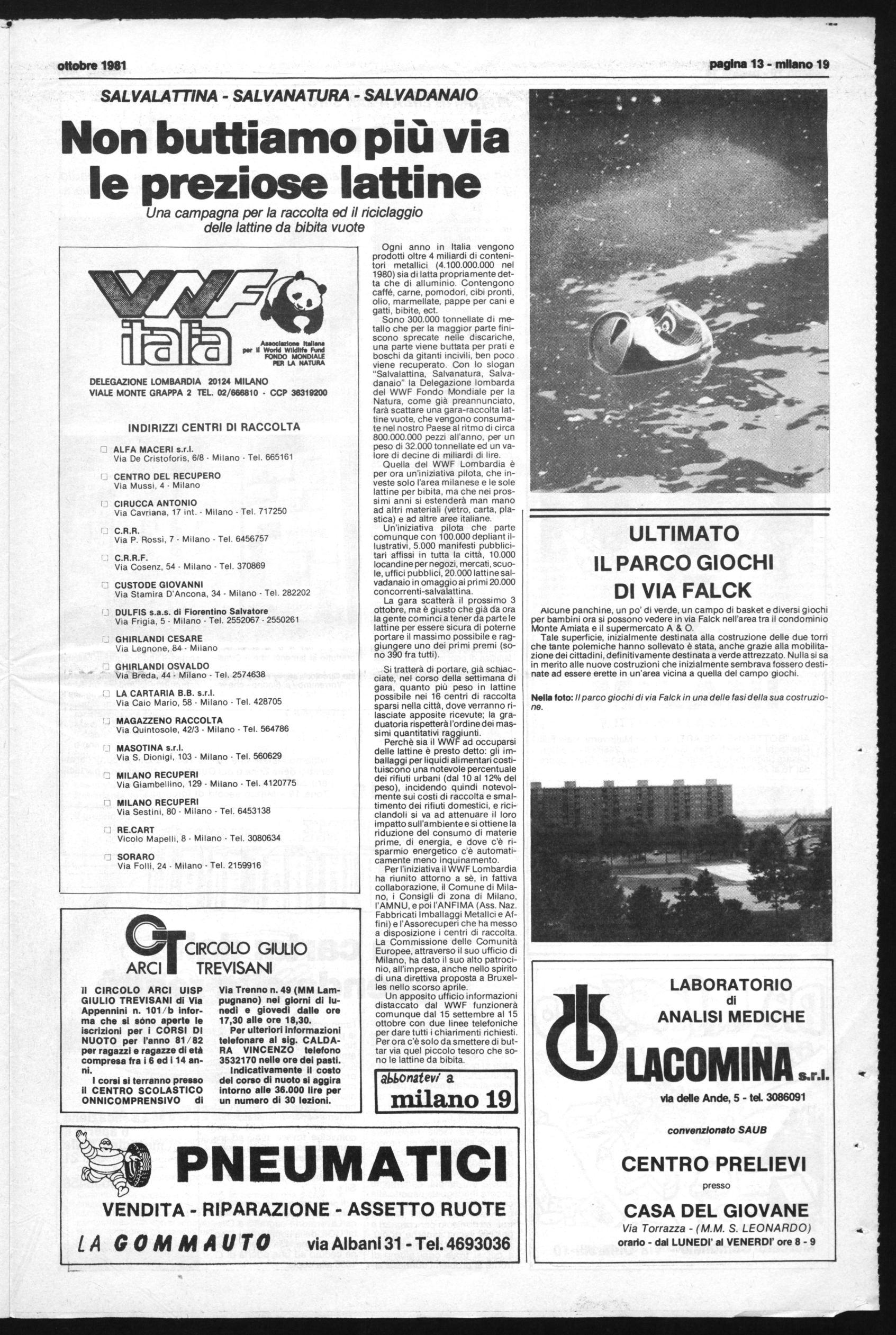 Un apposito ufficio informazioni distaccato dal WWF funzionerà comunque dal 15 settembre al 15 ottobre con due linee telefoniche per dare tutti i chiarimenti richiesti. Per ora c'è solo da smettere di buttar via quel piccolo tesoro che sono le lattine da bibita. abbonatevi a milano