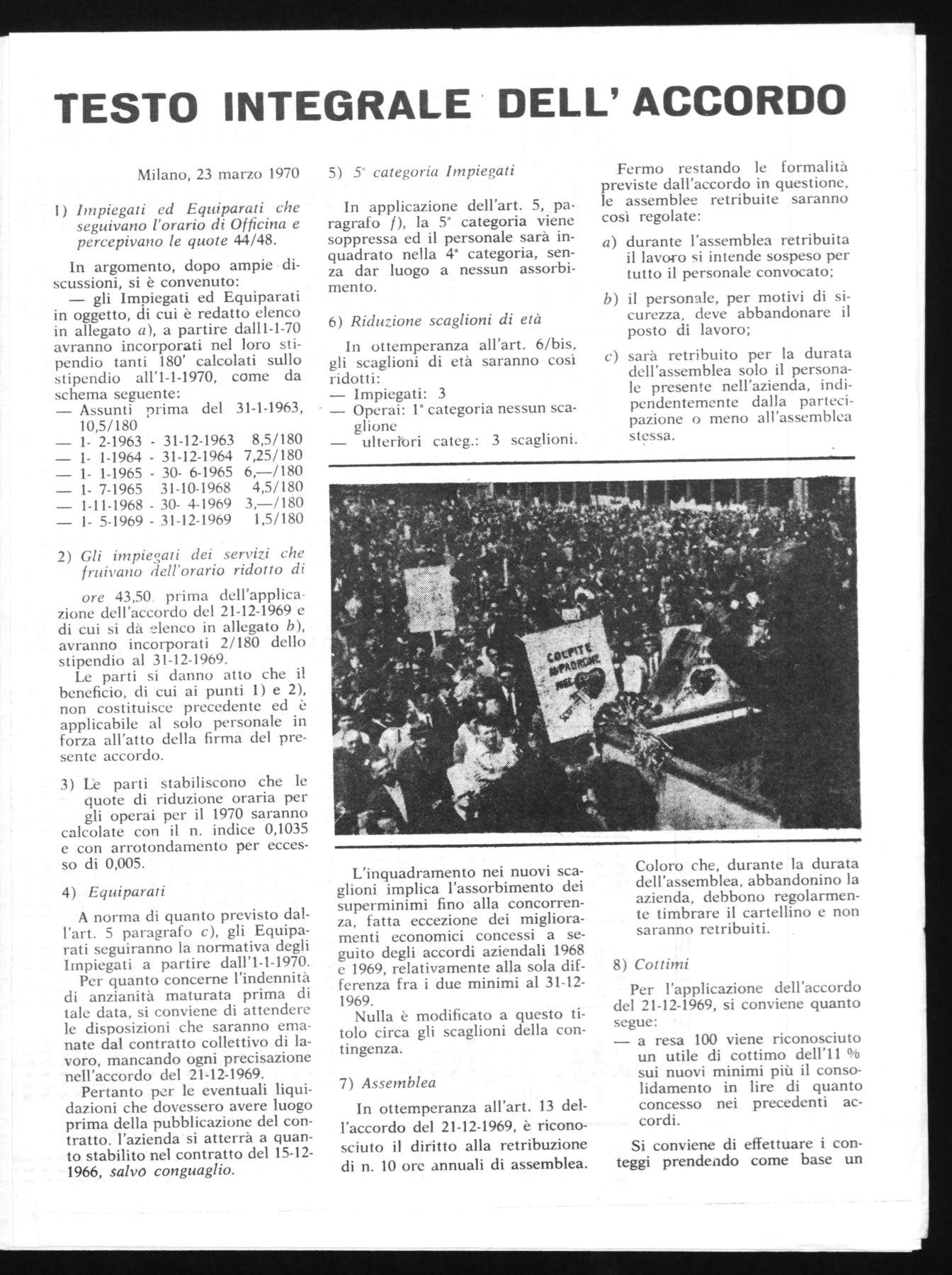 La Direzione esaminata la richiesta avanzata dalla Commissione Interna in nome e per conto degli operai rappresentati, si dichiara disposta ad attuare in via provvisoria e sperimentale l'orario proposto. riconfermando che le ore fatte in più nella seconda settimana si intendono a compenso delle ore della prima settimana quindi non influiscono su alcun istituto contrattuale.