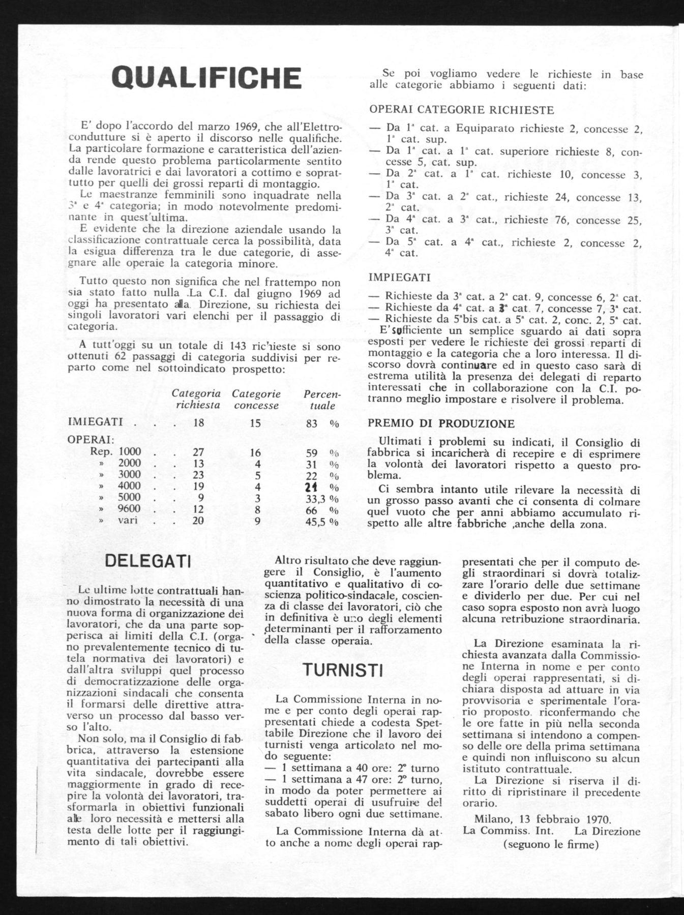 E' dopo l'accordo del marzo 1969, che all'Elettrocondutture si è aperto il discorso nelle qualifiche. La particolare formazione e caratteristica dell'azienda rende questo problema particolarmente sentito dalle lavoratrici e dai lavoratori a cottimo e soprattutto per quelli dei grossi reparti di montaggio.