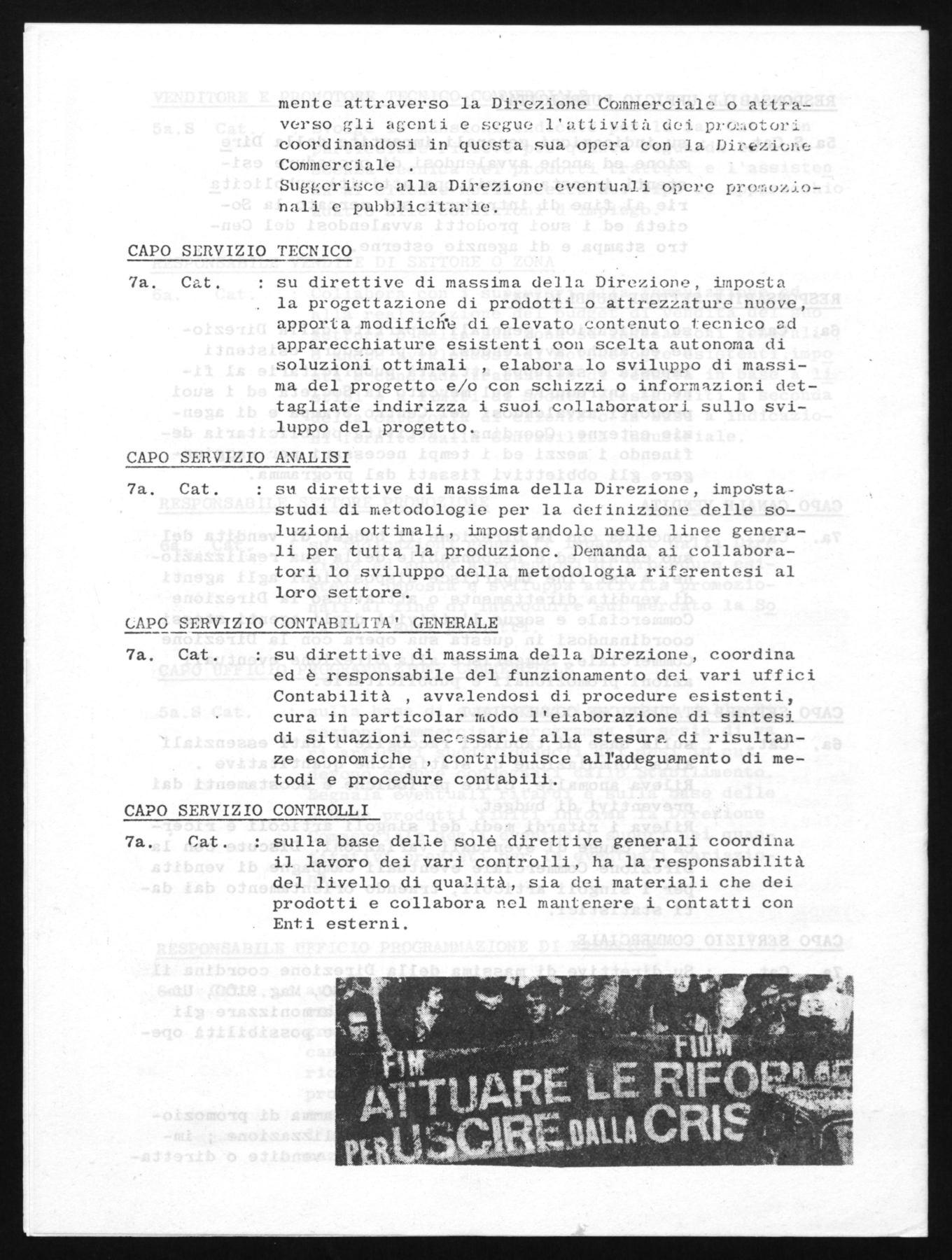 7a. Cat. : su direttive di massima della Direzione, impostastudi di metodologie per la definizione delle soluzioni ottimali, impostandole nelle linee generali per tutta la produzione. Demanda ai collaboratori lo sviluppo della metodologia riferentesi al loro settore.