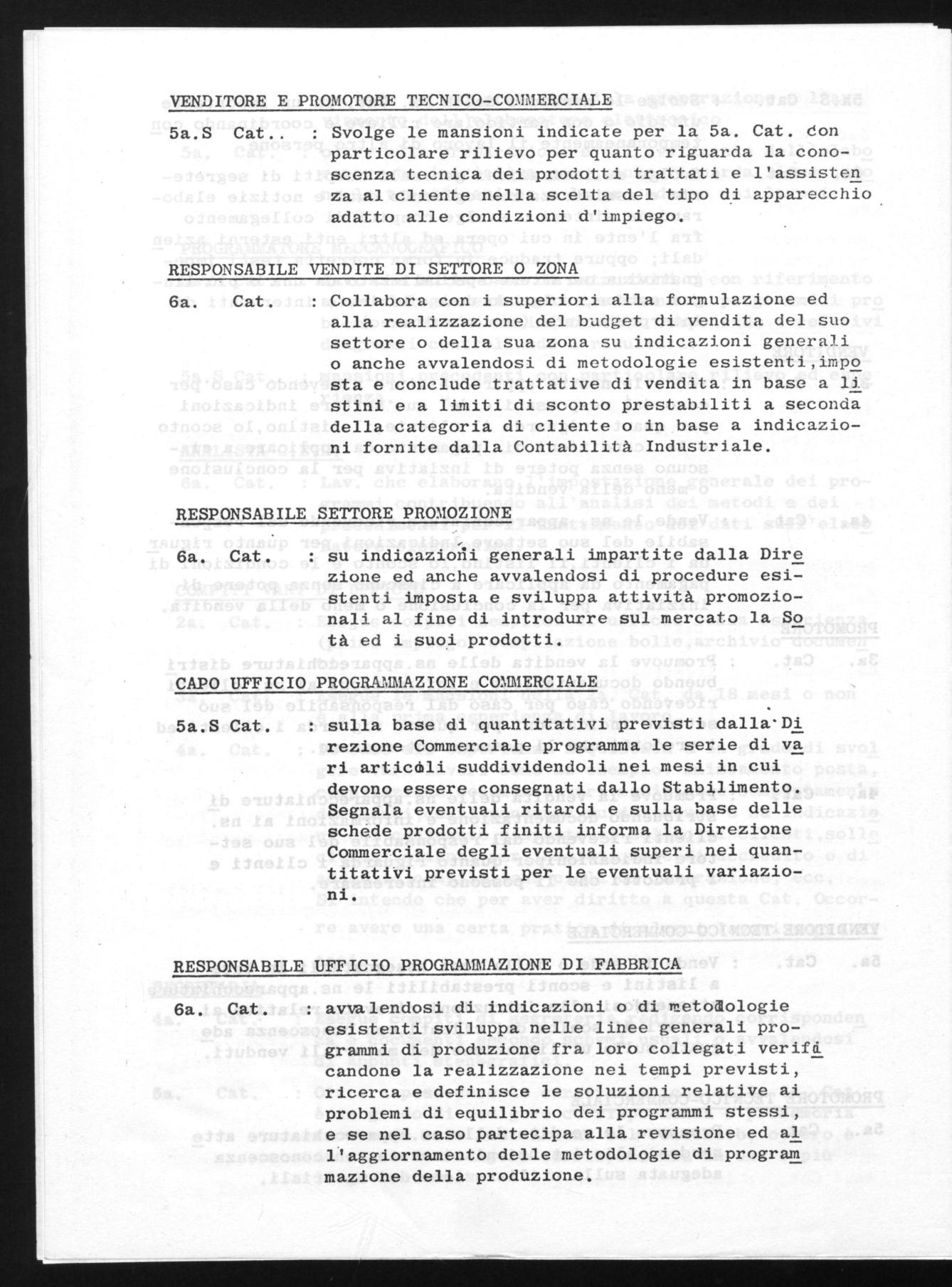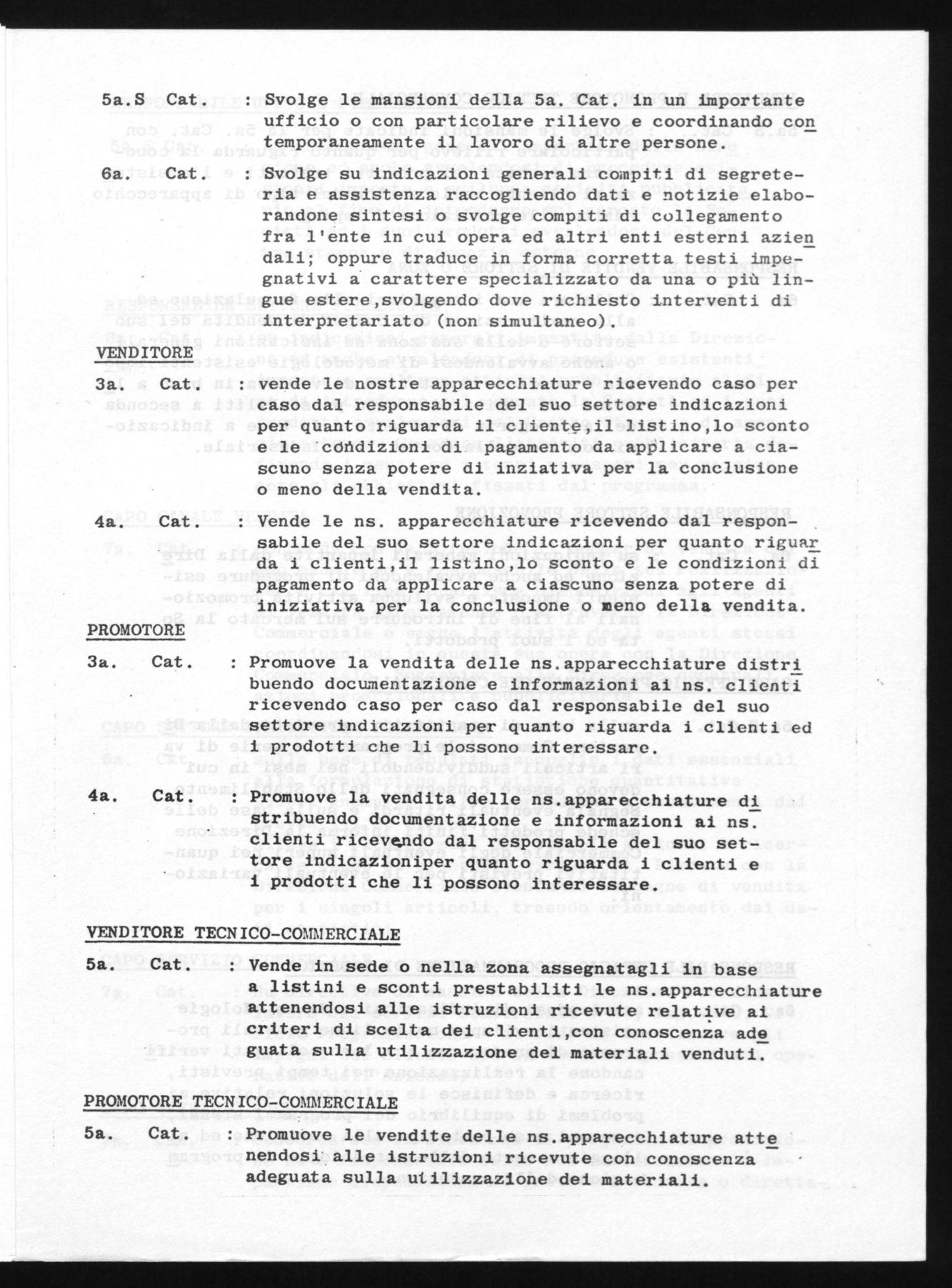 3a. Cat. : vende le nostre apparecchiature ricevendo caso per caso dal responsabile del suo settore indicazioni per quanto riguarda il cliente,il listino,lo sconto e le cdhdizioni di pagamento da applicare a ciascuno senza potere di inziativa per la conclusione o meno della vendita.
