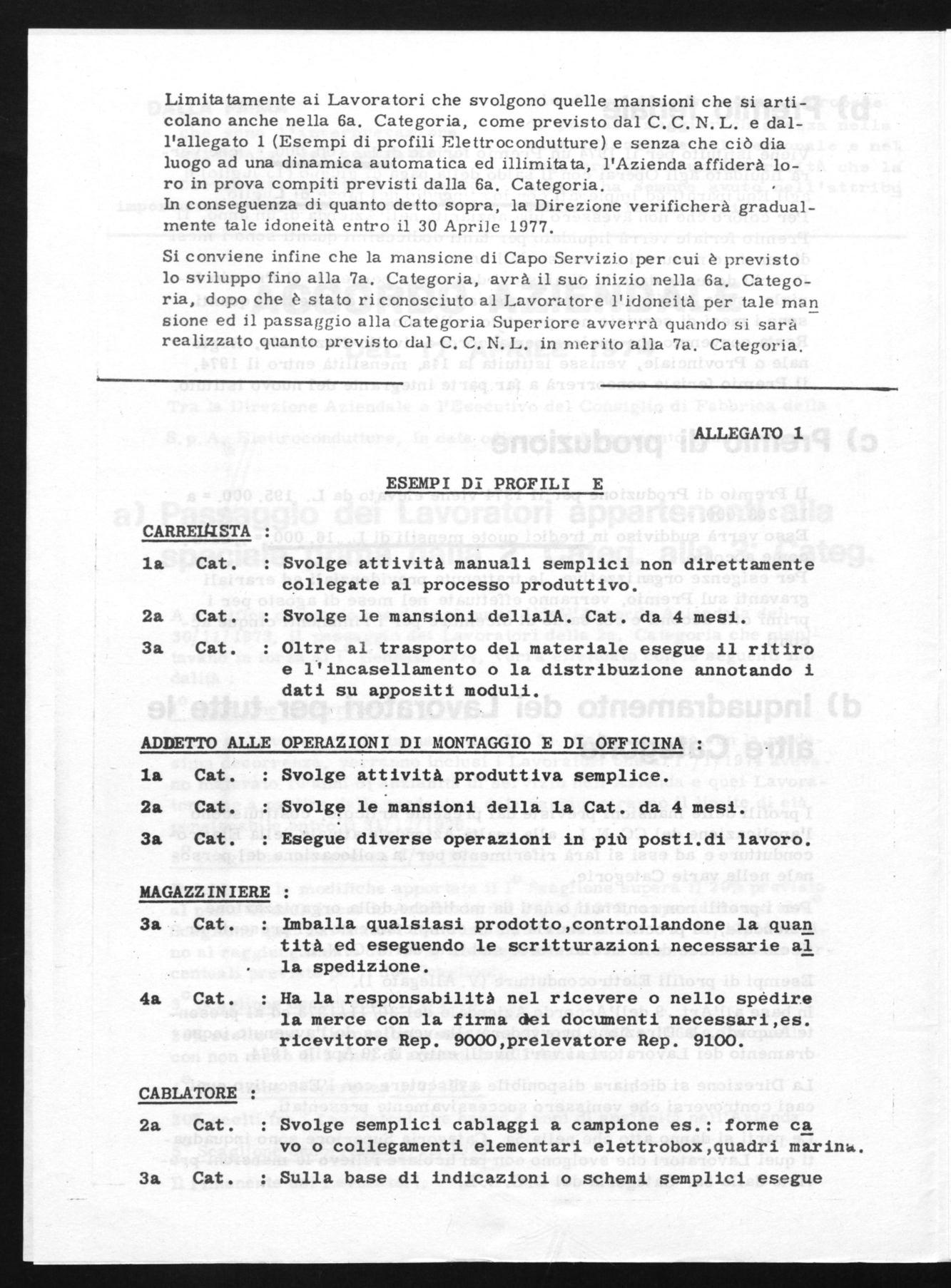 Limitatamente ai Lavoratori che svolgono quelle mansioni che si articolano anche nella 6a. Categoria, come previsto dal C.C. N. L. e dall'allegato 1 (Esempi di profili Elettrocondutture) e senza che ciò dia luogo ad una dinamica automatica ed illimitata, l'Azienda affiderà loro in prova compiti previsti dalla 6a. Categoria. In conseguenza di quanto detto sopra, la Direzione verificherà gradualmente tale idoneità entro il 30 Aprile 1977.