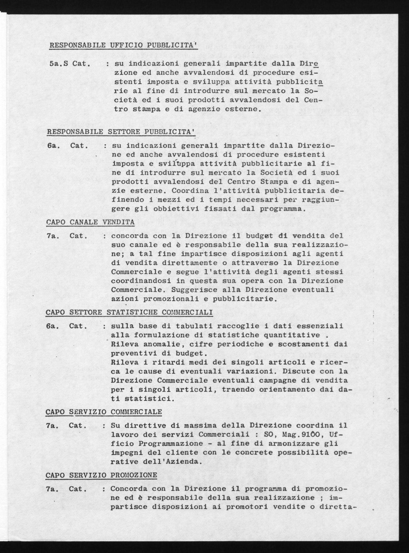 5a.S Cat. : su indicazioni generali impartite dalla Dire zione ed anche avvalendosi di procedure esistenti imposta e sviluppa attività pubblicita rie al fine di introdurre sul mercato la Società ed i suoi prodotti avvalendosi del Centro stampa e di agenzie esterne.