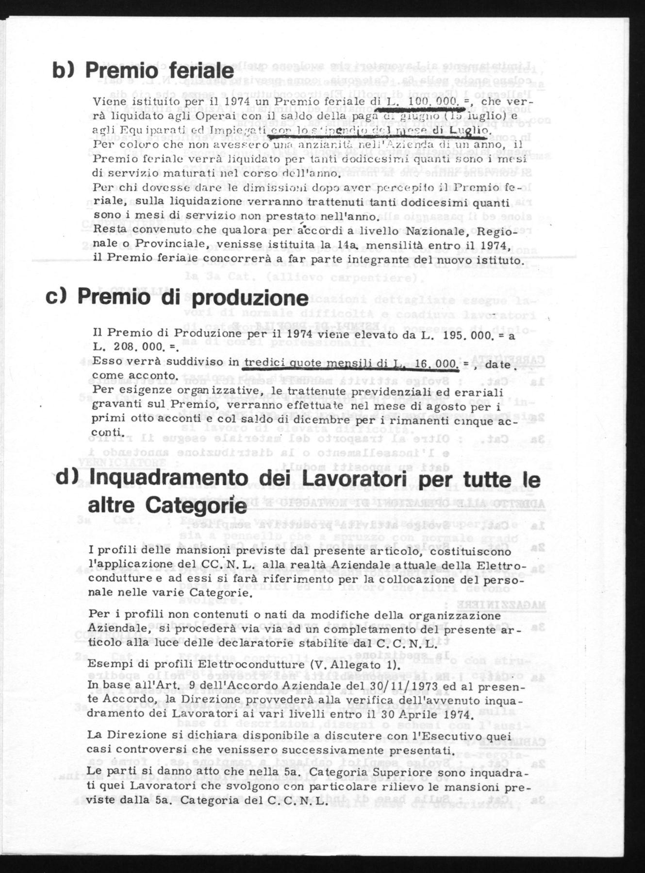 Il Premio di Produzione per il 1974 viene elevato da L. 195. 000. = a L. 208. 000. =. Esso verrà suddiviso in tredici quote mensili di 16. 000. = , date. come acconto.