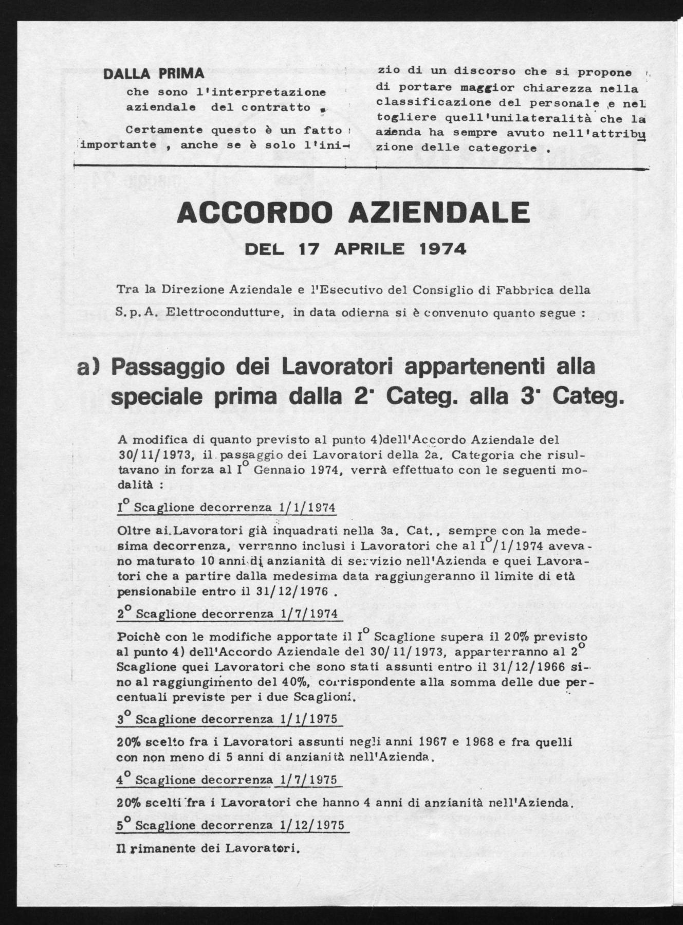 A modifica di quanto previsto al punto 4)dell'Accordo Aziendale del 30/11/1973, il passaggio dei Lavoratori della 2a. Categoria che risultavano in forza al IoGennaio 1974, verrà effettuato con le seguenti modalità :